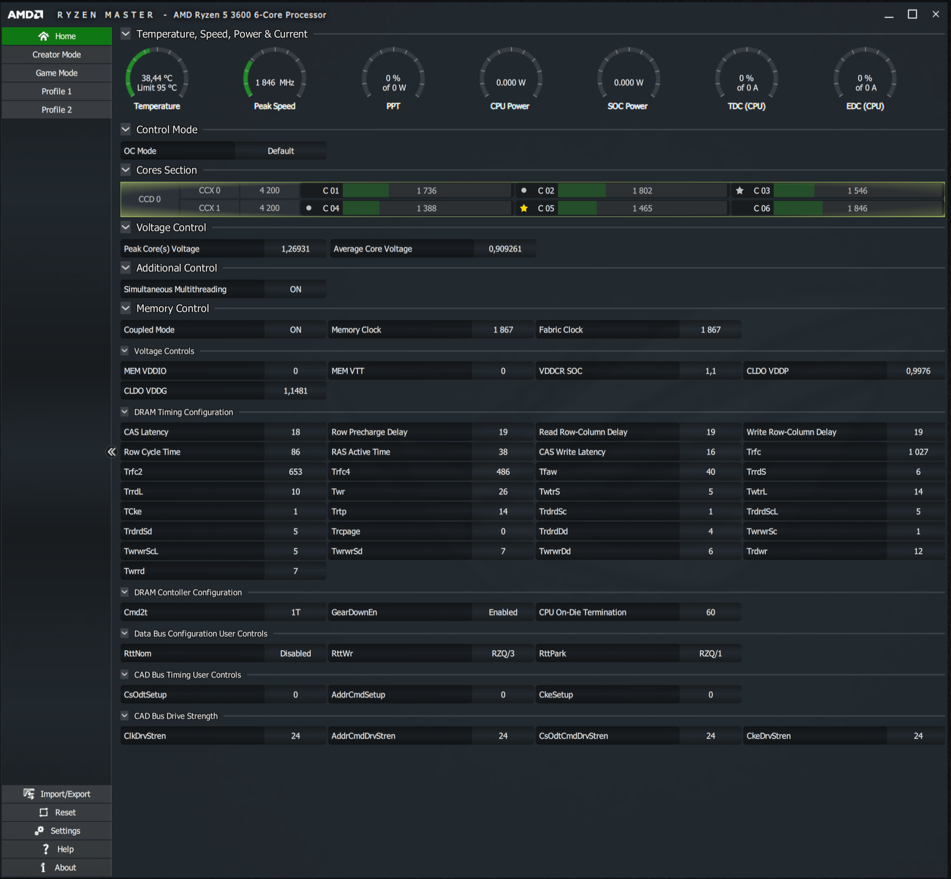 Приобрёл кит Neo Forza FAYE [NMUD432E82-3000DB21] 64 ГБ. В памяти зашиты только стандартные Jedec 2666 и ниже. Всё остальное надо делать вручную. Trfc просто запредельный. Чипы Hynix, но какие - неизвестно. DRAM Ryzen Calculator профиль на такие чипы не имеет. Все профили для Hynix не работают: ПК не запускается. Но память неплохо гонится аж до 3733 МГц.
