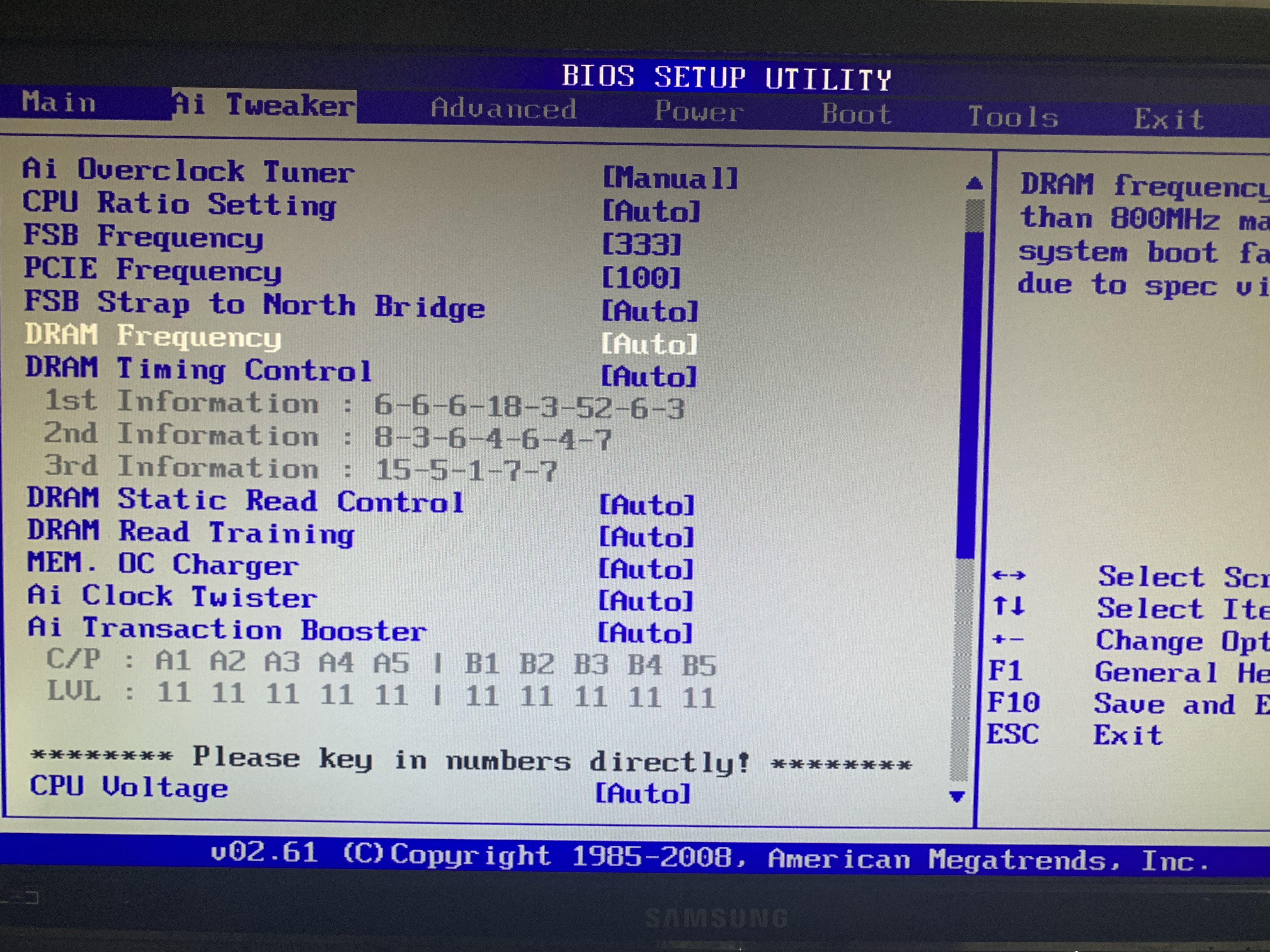 В меню Ai Tweaker отсутствует пункт System memory multiplier, скриншот приложил. DRAM Frequency позволяет выбрать значения Auto/667/800/835/887/1002/1066/1111/1335, но я так понял мне надо понизить частоту памяти, чтобы она поднялась за счет повышения FSB Frequency, а как сделать непонятно.