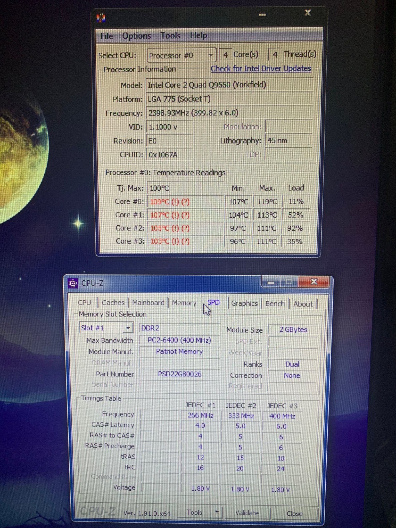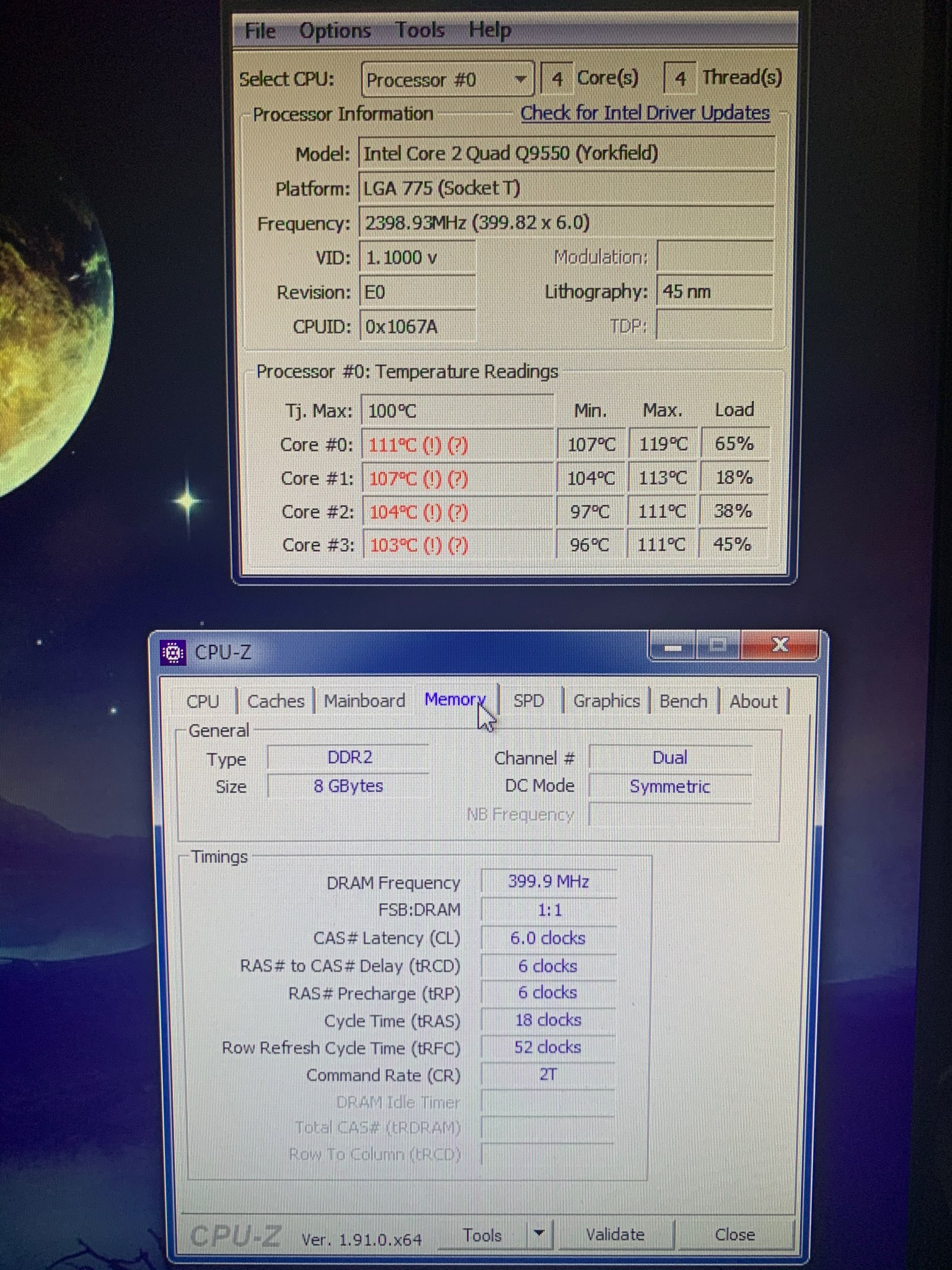 Есть такая система: Мать: Asus P5QPro CPU: Intel Core 2 Quad Q9550 RAM, 8Gb DDR2: 2*2Gb PC2-6400 (400Mhz) Patriot Memory + 2*2Gb PC2-6400 (400Mhz) SK Hynix Video: GeForce 1050Ti 4Gb БП: Corsair RM750x Cooler: GlacialTech Igloo 5750 Silent HDD: SSD 256 Plextor под Windows + 2TB HDD