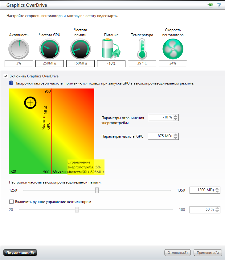 Сборки с головой хватает для работы, но в последнее время начал замечать, что в играх (Танки) FPS не хватает. Сначала думал, что проблема в дровах, так как их давно не обновляли. После обновления ситуация не изменилась. Начал лазить по AMD Сatalyst Control Center (ACCC). Нашёл Graphics OverDrive. Частота GPU была выставлена на 800 (номинальная частота), поднял до 875 и выставил ограничение энергопотребления -10% (процент подбирал исходя из цветовой палитры, на 800 МГц маркер был в жёлтой зоне, предположил, что тепловыделение). Кроме частоты GPU поднял частоту памяти с 1250 до 1300. В стресс-тесте температура поднялась до 62 градусов (без стресса - 39 градусов) при рабочей - 82 градуса.