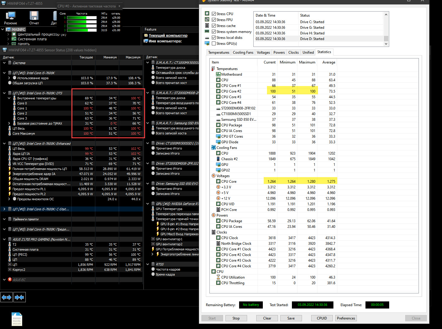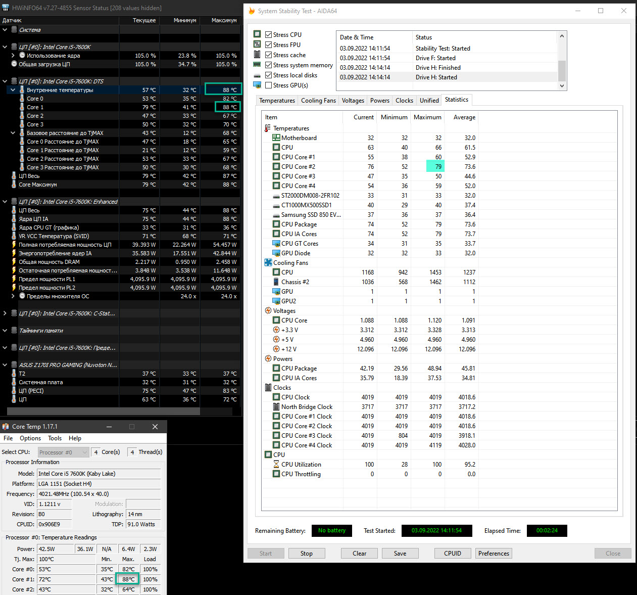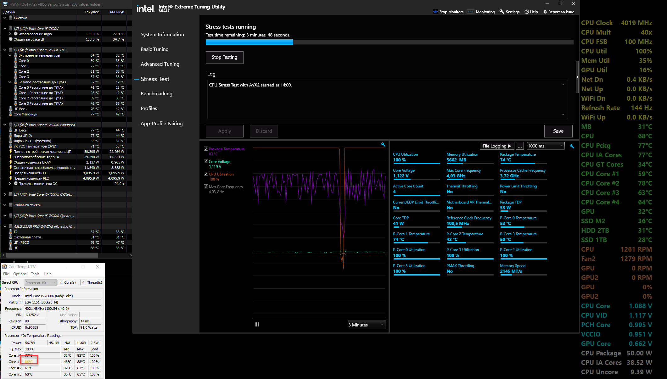 Всем привет, Есть комп на базе Asus Z170I Pro Gaming в Cooler Master np200r с be quiet! Pure Loop 240mm. Поставил в него i5-7600k и думал его разогнать. Но он с настройками по умолчанию в BIOS в AIDA64 Stress Test за 1-2 минуты нагревается до 79-80 градусов, а в Intel Extreme Tuning Utility до 84-88 градусов. Это на 4 ГГц.