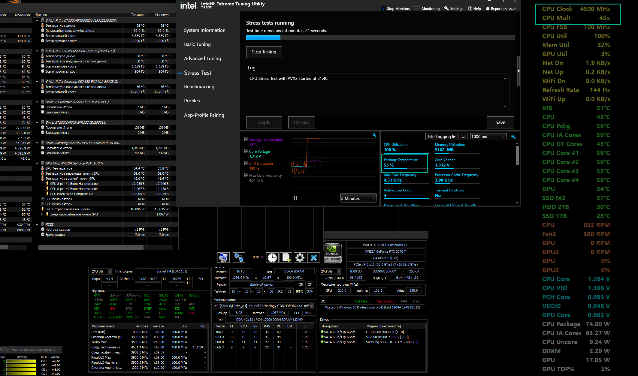 Температуры смотрю сразу и в AIDA64, и в HWinfo, и в Intel Extreme Tuning Utility , ну и Core Temp Попробовал "разогнать" - поставил множитель 44 и напряжение 1,275В. В AIDA64 Stress Test за пару секунд "улетает" в 100 градусов и троттлинг начинается. Это экземпляр процессора такой "удачный" попался? Или у него от времени термоинтерфейс под крышкой совсем плохой стал?