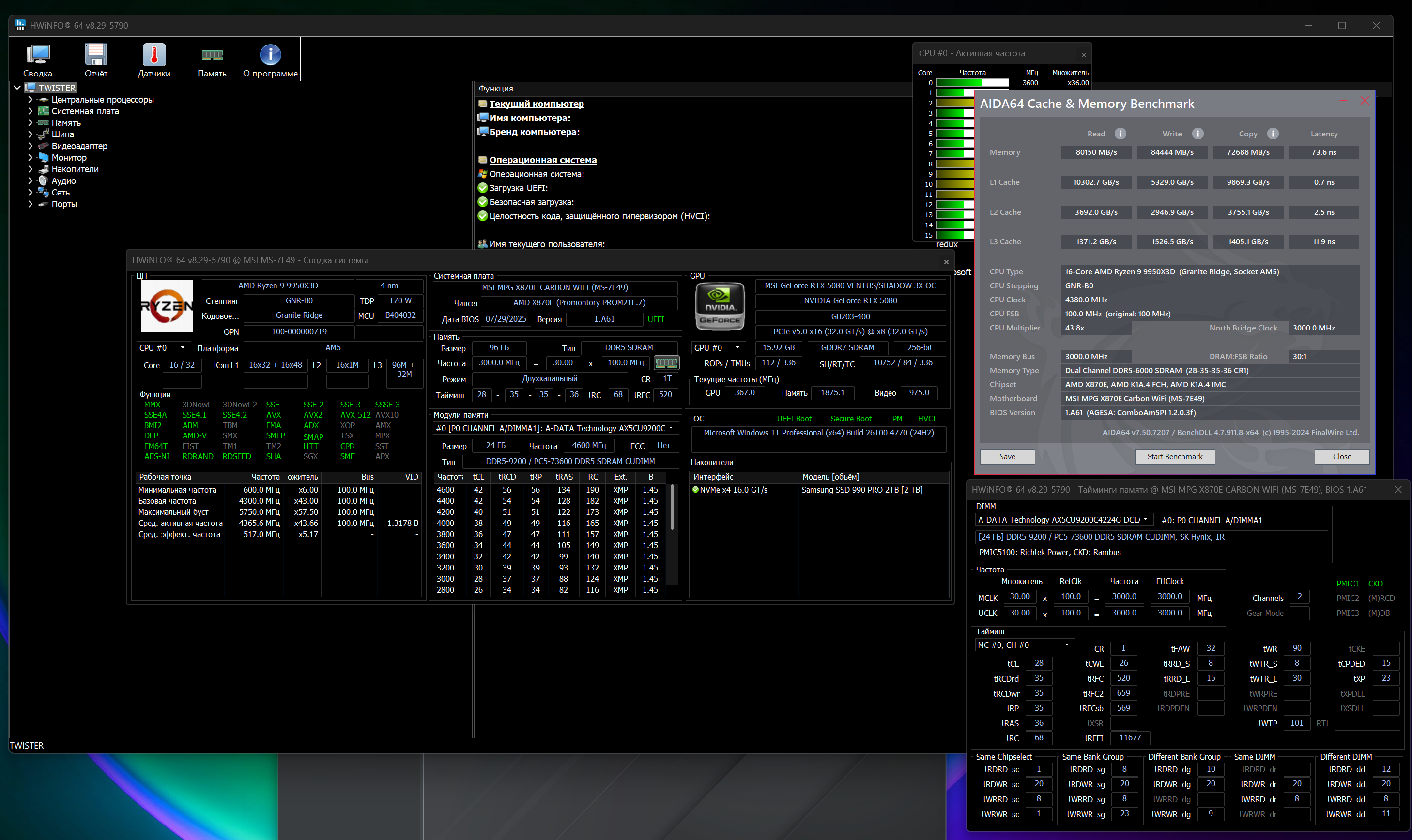 Память (2 комплекта) - ADATA XPG Lancer RGB [AX5CU9200C4224G-DCLACRSG] 48 ГБ Материнская - MSI MPG x870e carbon wifi (сырая с глюками конечно же) Процессор - 9950x3d Видеокарта - 5080rtx (Интересный факт: если ее включать, нужно на память приподнять напряжение, наверное просадка) Блок питания - MSI MEG Ai1300P PCIE5 [306-7ZP4A11-CE0]