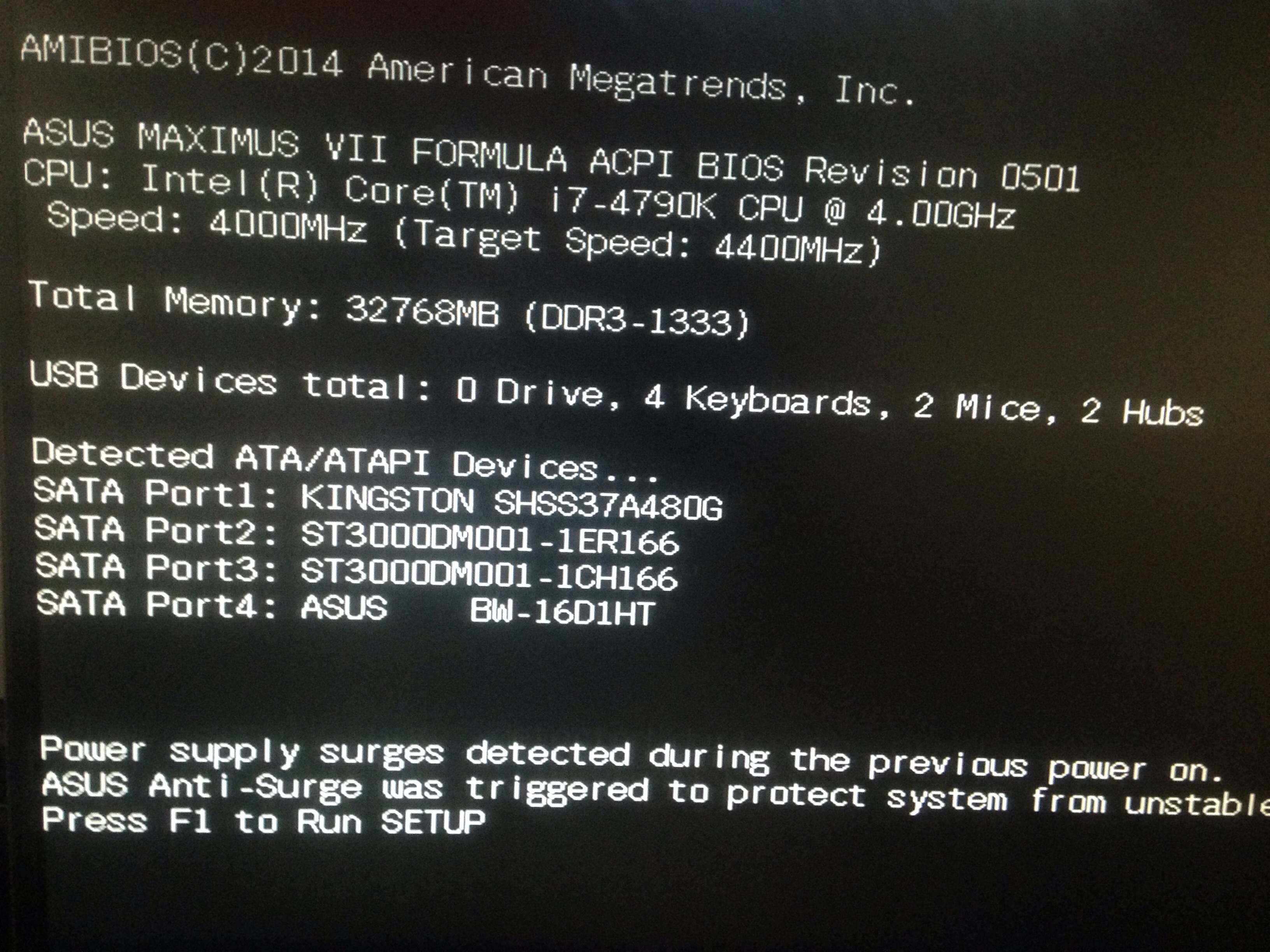 Здравствуйте. Неделю назад собрал новый компьютер(перечень комплектующих ниже). Появилась проблема. После часа игры в GTA V система намертво повисла и сама перезагрузилась. В журнале windows сообщается об ошибке kernel power 41(63). Решил прогнать Furmark(после сборки стресс-тест прошел успешно). После запуска просто черный экран и дальше перезагрузка. После этого началось самое веселое. При запуске комп выключается и через 2-5 сек. опять включается. Он может вырубиться в windows спустя пару минут после запуска. А может и в биосе вырубиться. Порой просто запускается и не показывается логотип биос. Так и стоит. А порой вообще не горит лого GEFORCE GTX, процессорный кулер не заводится, работают только корпусные вентиляторы. Синих экранов не было, система или грузится(но потом благополучно выключается) или предлагает восстановить windows. Загрузка с точки восстановления не помогла. Дело не в ОС и не в дровах, если даже в биосе он может выключиться. Разгона нет(разве что оперативку заставил работать на 1600 т.к. по умолчанию она на 1333 стоит. Сбрасывал, но тоже не помогает. Отключал вторую видеокарту, аудиокарту, вообще без PCI-E карт запускал. Не помогло. Чистил CMOS, сбрасывал биос и ничего. Температуры в норме, проц 30-35 в простое, под нагрузкой 50-55. Пыли нет совсем, сборке неделя. После перезапуска биос выдает уведомление о том, что система была перезагружена из-за нестабильного БП(фича Psu anti-surge. Отключать не буду, мало ли)Облазил кучу форумов, посмотрел кучу видео и не нашел точного ответа и решения моей проблемы. Собственно сам комп: Microsoft Windows 8.1 Pro 64-bit Retail RUS Cooler Master HAF X RC-942 ASUS MAXIMUS VII FORMULA Intel Core i7-4790K Cooler Master V8 GTS Corsair Vengeance Pro CMY16GX3M2A1600C9R (брал два одинаковых комплекта по 16, так как единого на 32 не было). Оперативка на 1333 по умолчанию работает, через биос 1600 поставил. Оперативка ладит, memtest86+ ошибок не нашел. Palit GeForce GTX TITAN X(2-way SLI) ASUS Xonar Phoebus Kingston HyperX Savage 480GB Seagate ST3000DM001 x2 ASUS BW-16D1HT Pro Corsair RM1000 P.S. Есть еще небольшой вопрос. Первый титан в простое 30-35 градусов. Отличная температура. А второй 60-65. Не критично, но немного смущает. Под нагрузкой не выше 85 у двух титанов. Это нормально? Просто у меня большой бутерброд получился TITAN,PHOEBUS,TITAN. На этой материнке просто некуда больше вставлять. Еще в HWMonitor показывается 2 пункта температуры у SSD. Один норм(30 градусов), а другой ровно 100, причем всегда. Что-то с датчиком или глюк какой-то?