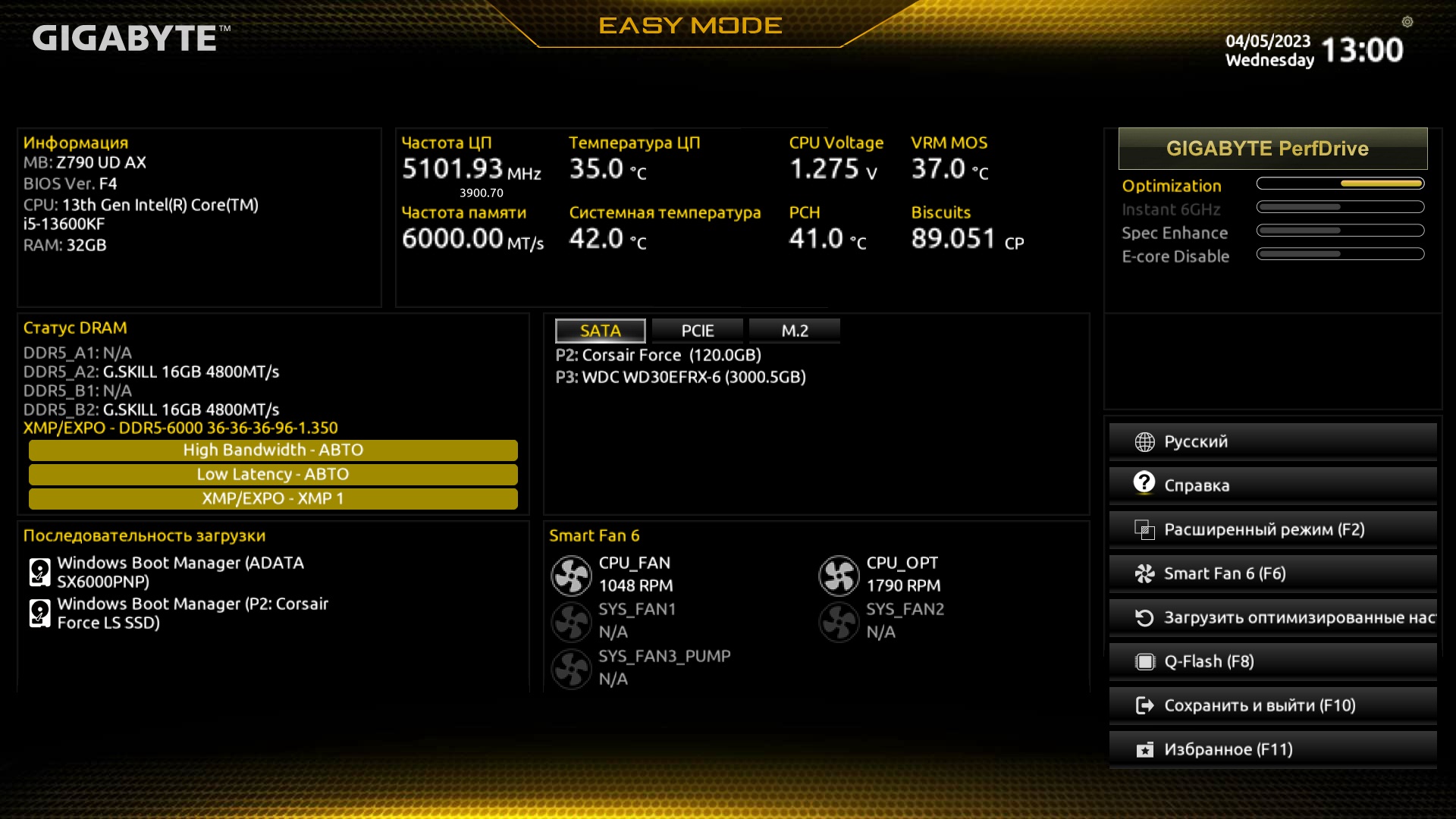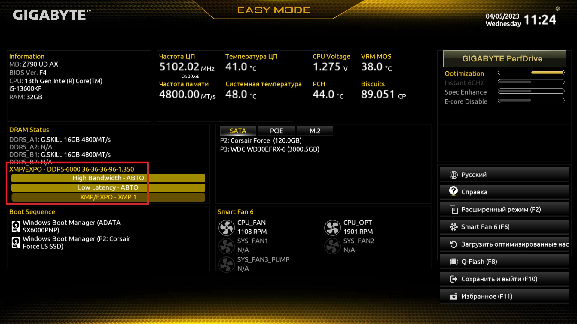 Здравствуйте! На днях собрал конфигурацию на плате Gigabyte Z790 UD AX и i5 13600KF + DDR5 6000 Все запустилось сразу, без каких либо проблем. Но по непонятному сценарию слышен писк, предположительно из подсистемы питания ЦП. Вопрос, возможно ли что то с этим сделать? Второй момент - по умолчанию память работает на 4800, почему так, хз. Пробую выбрать XMP профиль с 6000 мгц, но система не стартует, приходится только сбрасывать cmos. Что делаю не так?)