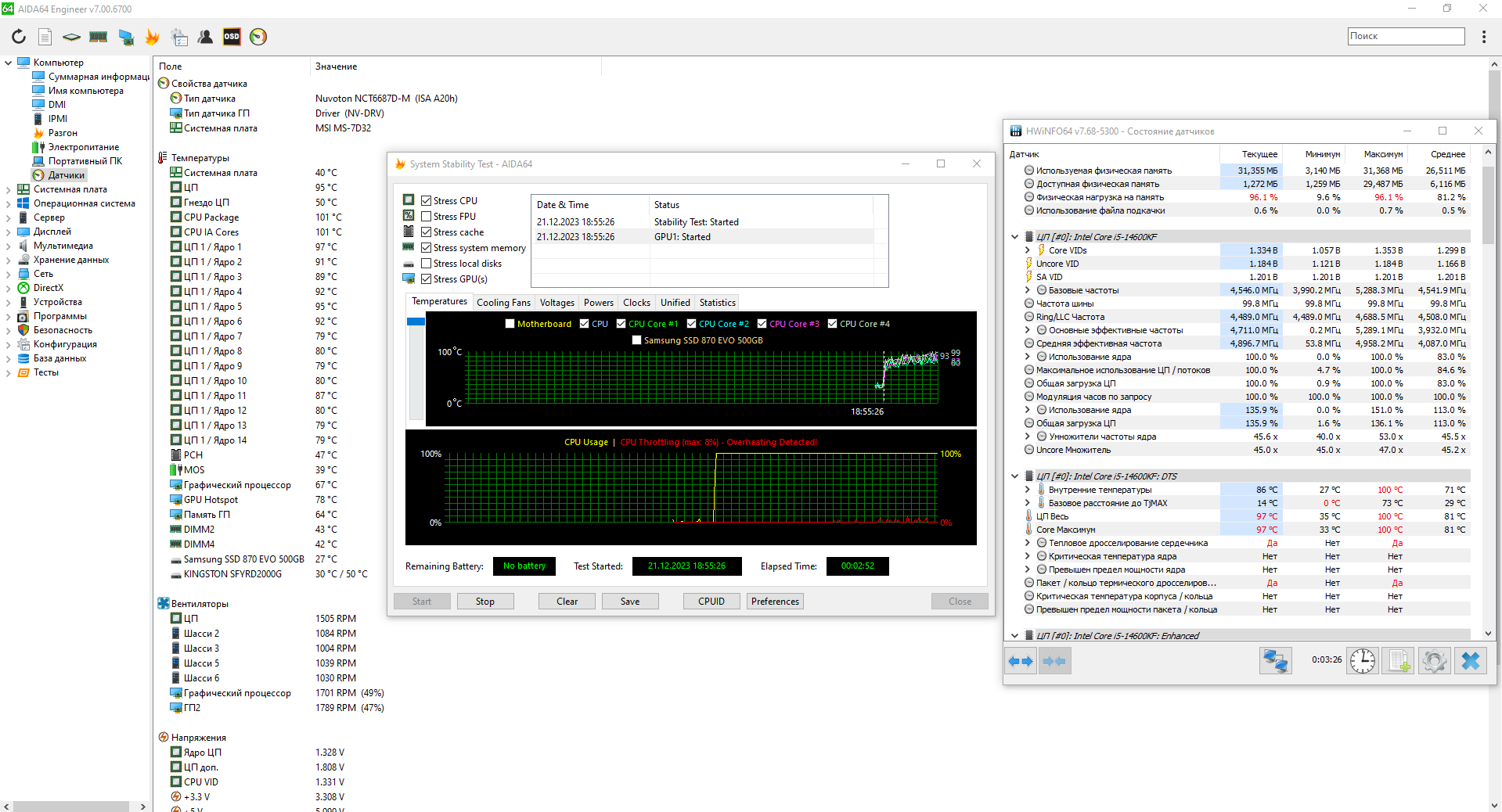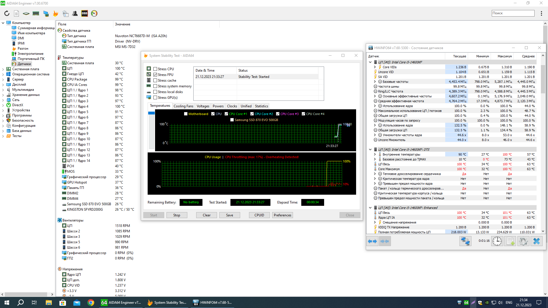 Приветствую. Собрал компьютер с процессором i5-14600KF и кулером Dark Rock PRO 4, в итоге в стресс тестах процессор греется под 100 градусов. Я ориентировался на процессор i5-13600KF, он такой же по характеристикам, и везде писали, что Dark Rock PRO 4 справляется с охлаждением. У процессорного кулера Dark Rock PRO 4 рассеиваемая мощность 250 Вт, по идее должно хватать. Но в моем случае это не так. Приложил скриншоты.