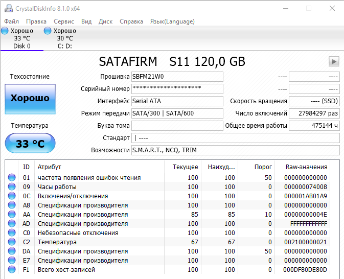 CrystalDiskInfo странные SMART данные показывает и прошивка отличается: на этикетке указана прошивка SBFM21.0, а в программе SBFM21W0