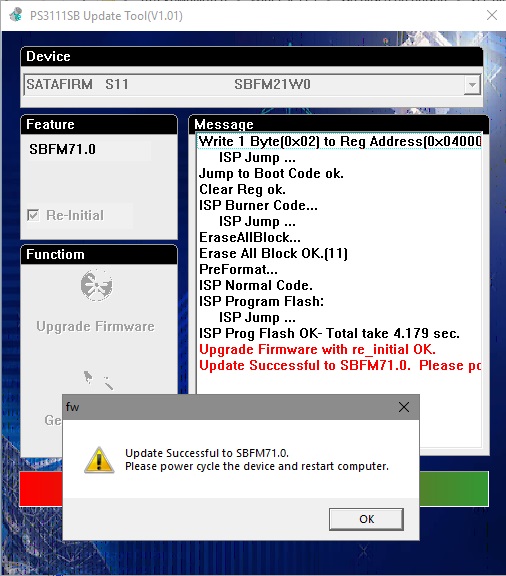 Контролер Phision s3111 прошивка 61.3 Манипуляции после которых разделы появляются: Unlocker S6 далее SATAToolBox_Complete_v1.15