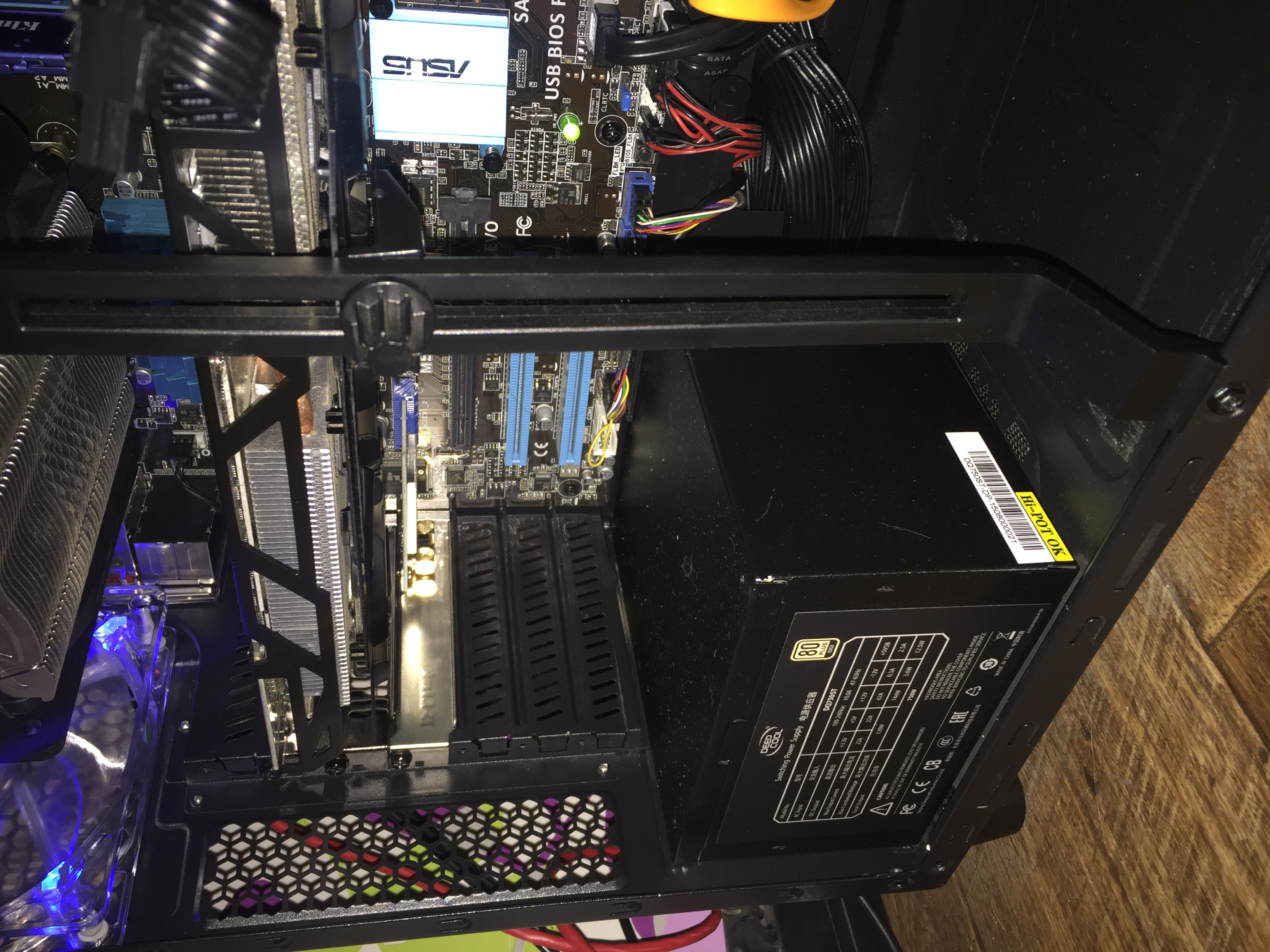 всем спасибо, проблема решилась сменой бп. в июне 2014-го брал свой за 2490р, сейчас ценник 6990р. http://www.dns-shop.ru/product/b94381f6 ... 020051-eu/ в пятницу 15.01 сдал по гарантии, в понедельник 18.01 получил деньги и приобрел deepcool dq750st за 7990р, принципиально выбирал с сертификатом 80 plus gold и хорошим кпд, мощность по линии 12v 744w http://www.dns-shop.ru/product/9a4aa6ee ... w-dq750st/ изображение на сайте не соответствует действительности, в комплекте не отцепляемые кабеля. работает очень тихо, разве что слышен щелчок при запуске и выключении, провода плоские без обмотки - у корсара в этом плане были чуть надежнее с виду, по длине все нормально, пустил все что можно под мп, хватило