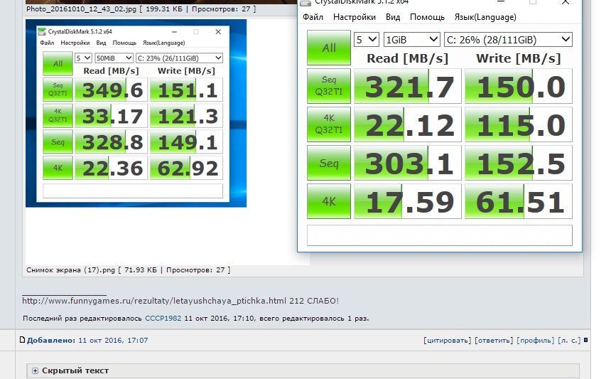 11motor CrystalDiskMark Вверху У друга сата3 реально тест по сата3 Внизу мой OCZ сата3 но подключет по сата3 а работает как сата2 ! реально должен выше r450 w280