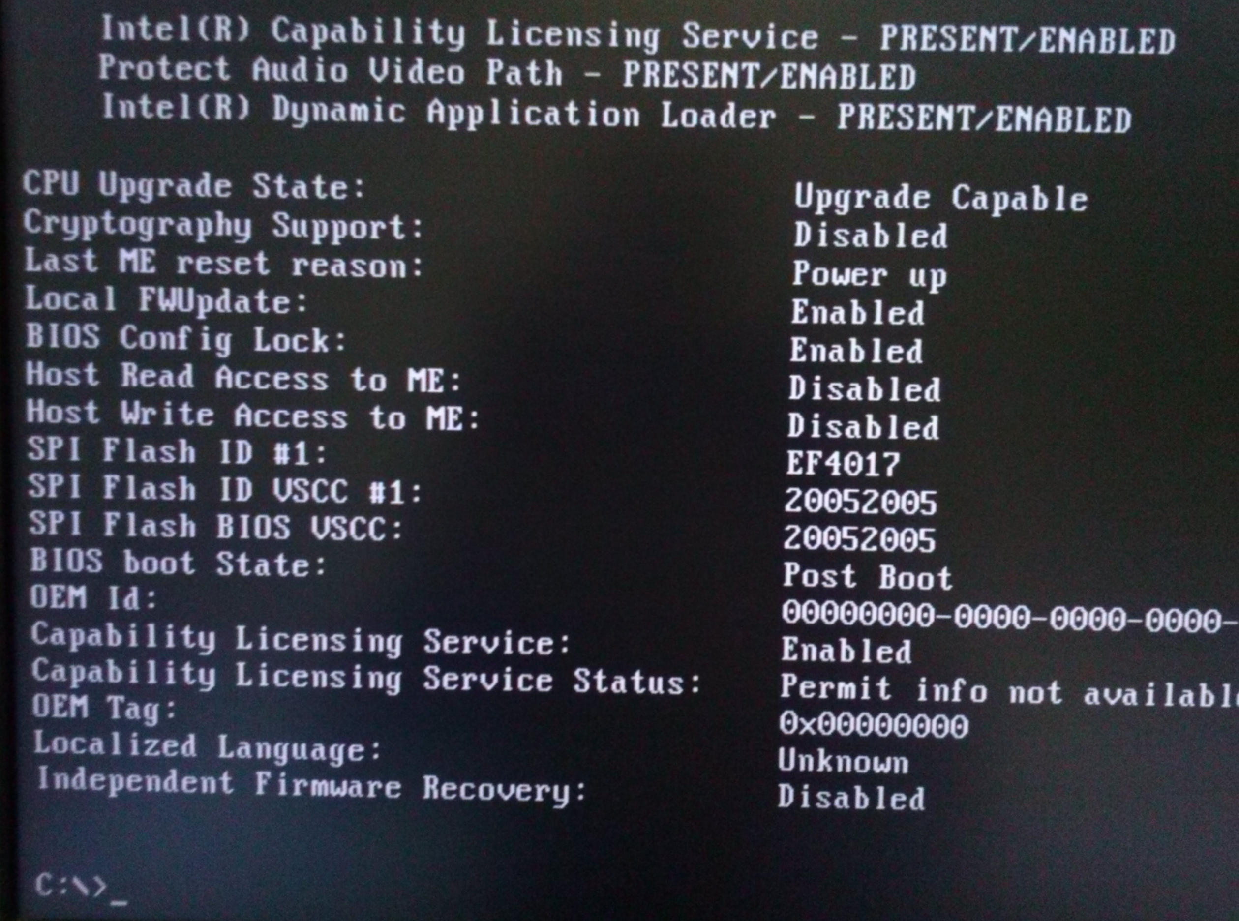 MEInfo: Проверяет, что ME работает нормально на уровне программного обеспечения / прошивки, запросив устройство ME на его состояние. Убедитесь, что он не сообщает о каких-либо красных ошибках. Желтый «регион GBE не существует». Предупреждение является нормальным для систем, у которых нет контроллера Intel GbE, вы можете спокойно его игнорировать.