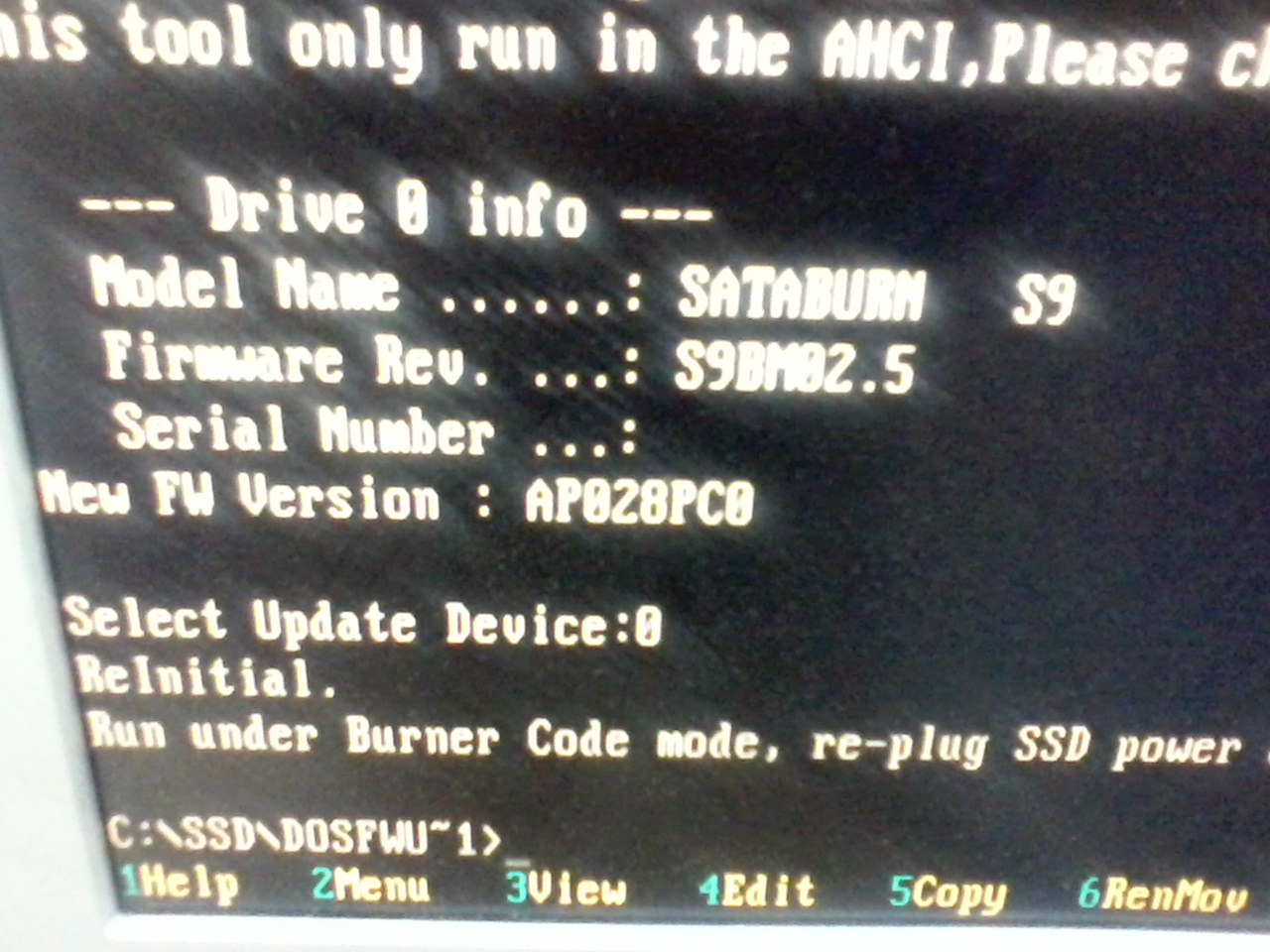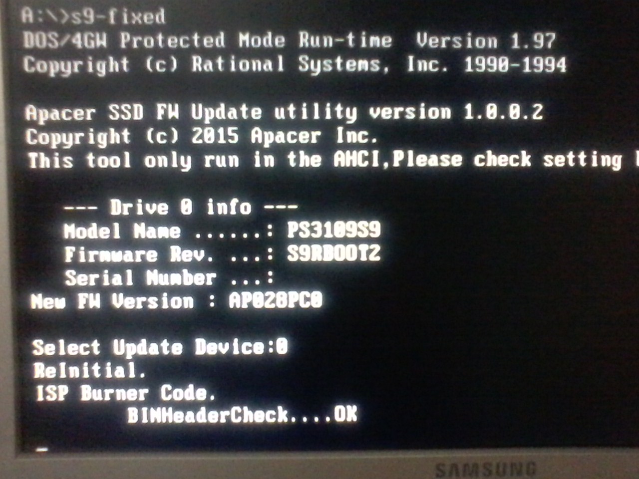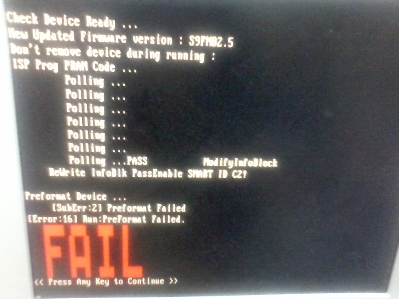 У меня после "удачной" прошивки SiliconPower на 60ГБ то же. В комм. строке пишет No Apacer. После ввода № диска пишет Bad Command Or Неправильное Имя файла. Выкидывать жалко память MLC. Контроллер PS3109-S9-J как в Вашем случае. ПОМОГИТЕ. Программой Phison Tool Box_Complete_v1.05 один раз воскрес, потом тишина.