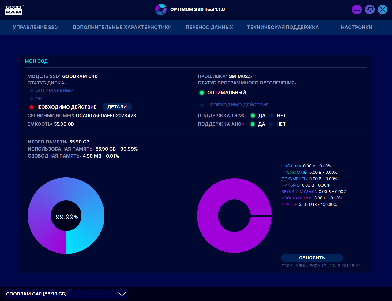 Подвезли еще один свежеумерший Гудрам. Потыкался с утилитами, поведение от предыдущих не отличается. Но отлежался пару дней и при следующем включении ожил, и дал скопировать информацию. Phison Toolbox показывает износ 77%. Хочу попробовать прошить более свежей чем 2.6 прошивкой. Гудрамовская утилита новых не предлагает. А какая в Phison Toolbox 1.15, который последний из доступных, не понятно. Шить наобум опасаюсь т к встречал информацию что у версии со встроенным прошивальщиком не проверяют тип памяти диска, что может его окирпичить. Или если она его опознала, то и шить можно спокойно?