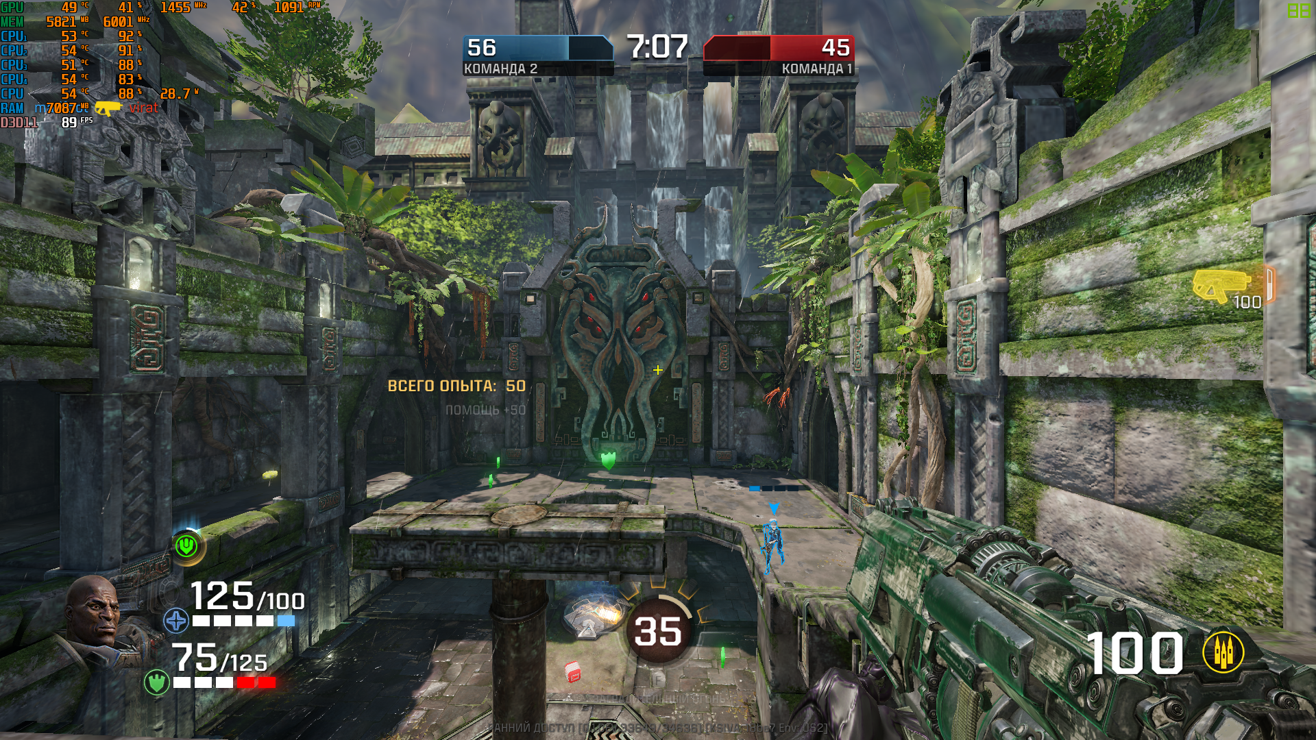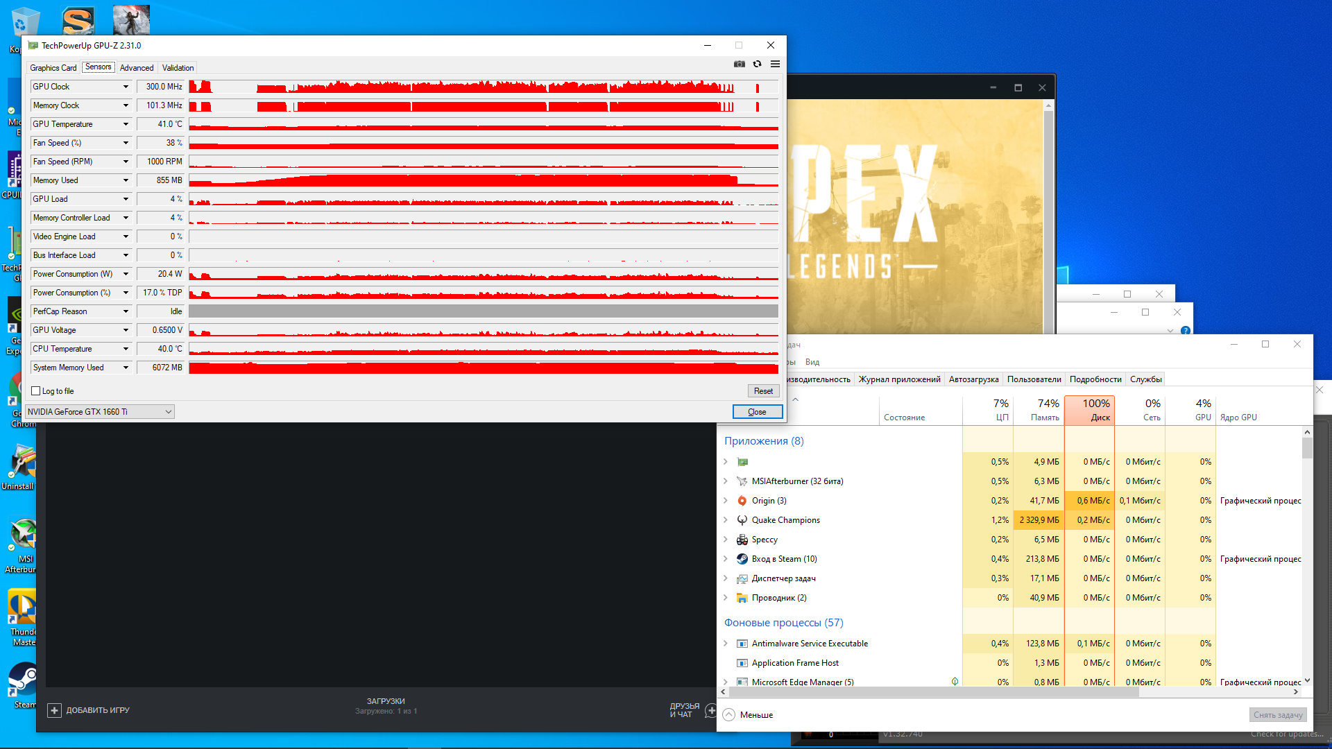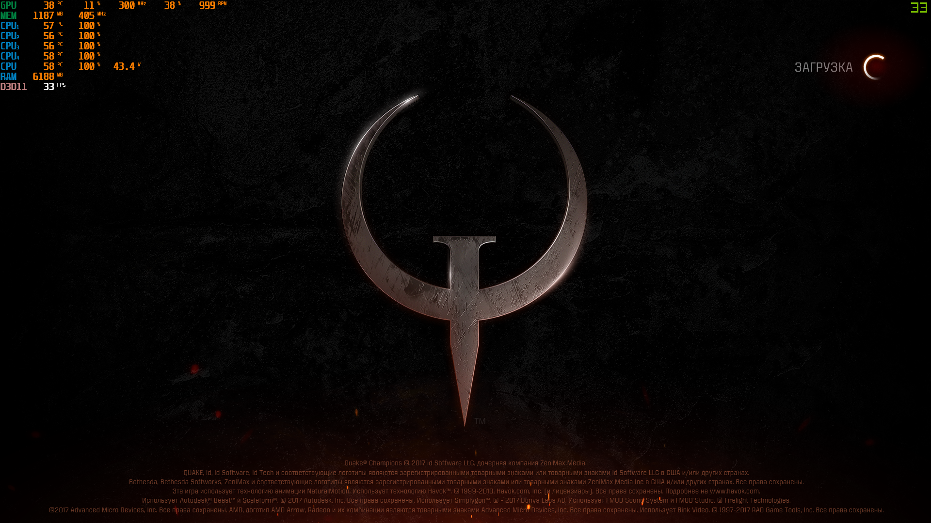 Врубил quake champions без лока фпс, он уже в загрузочном экране грузится на все 100% см. скрин в игре постоянные статтеры.. фризы. Не такие частые как при перегреве, но играть не комфортно. Температуры в норме, я абсолютно не понимаю что с системой случилось. Все было хорошо, такого не было. Сейчас еще в апексе проверю.