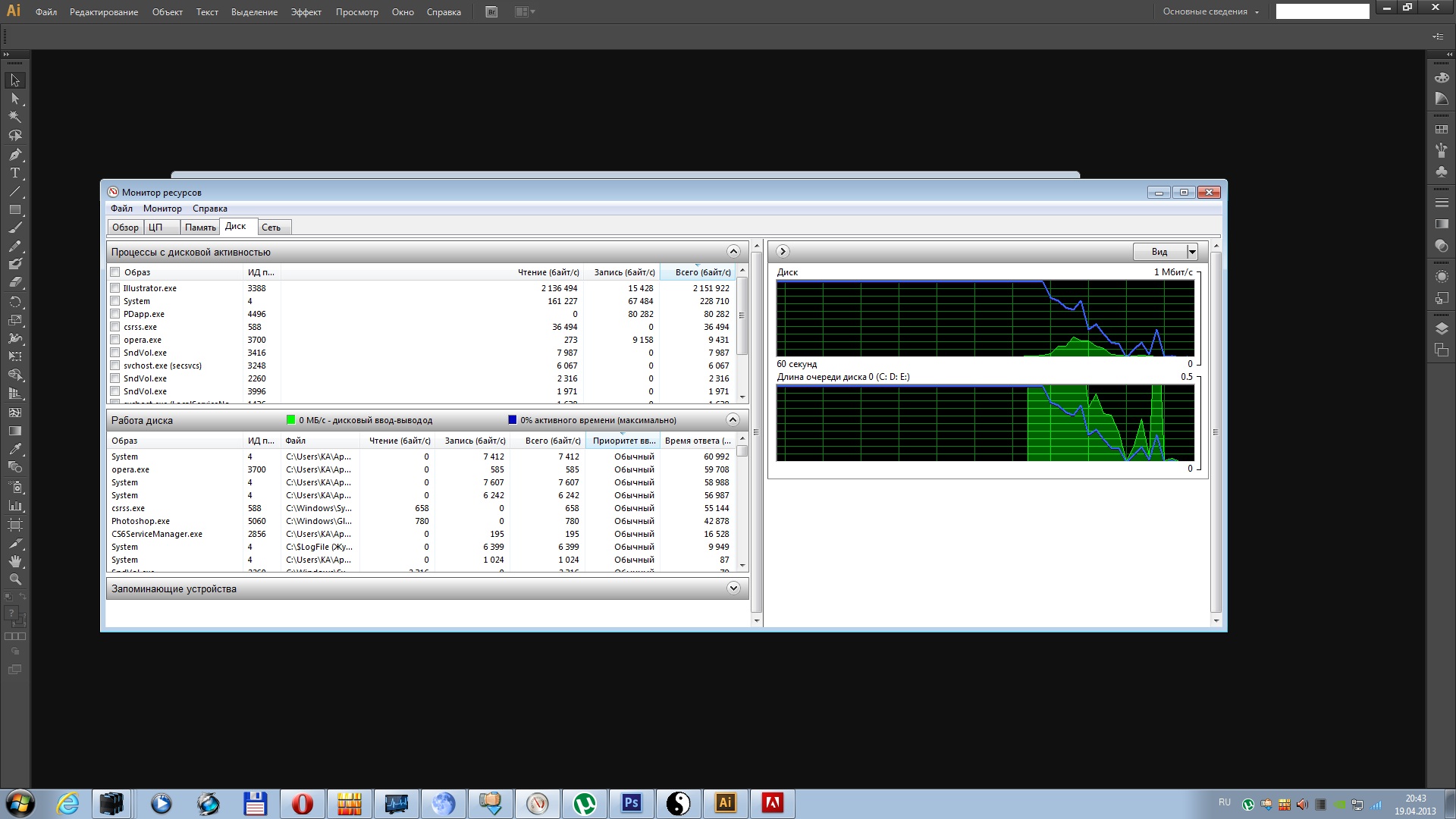 На графике в мониторе ресурсов наблюдается поднятие активного времени до 100%, при этом активность пропадает полностью. Через минуту все начинает работать снова. При этом от нагрузки на систему в целом, висяки не зависят.