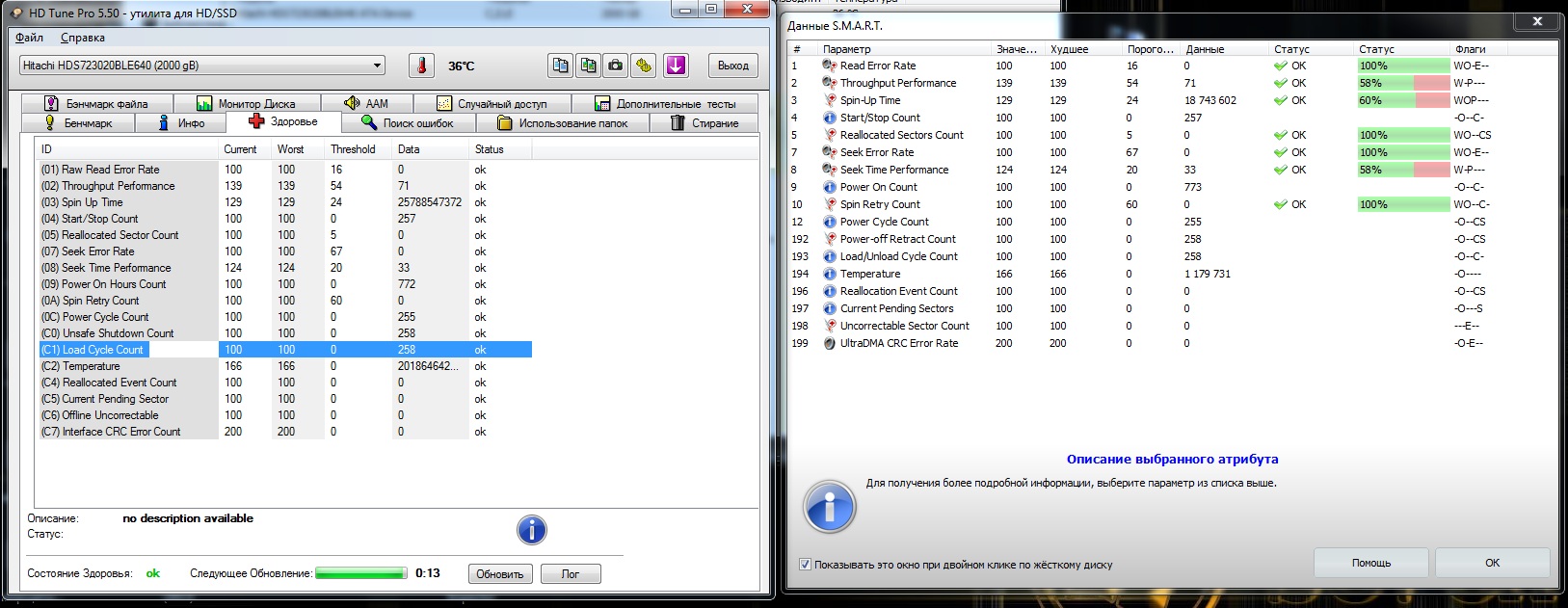 Что за хрень в spinup time? 0x6:011E:012C, 0x011E:0132... Что у хитачи означает этот параметр? На время раскрутки никак не похоже ни в одном из полей. Смущает 0x6 в первом поле, которое при следующем запуске исчезло - попытки раскрутки или рекалибровки? Тем более параметра Recalibration Retries у него вообще нет.