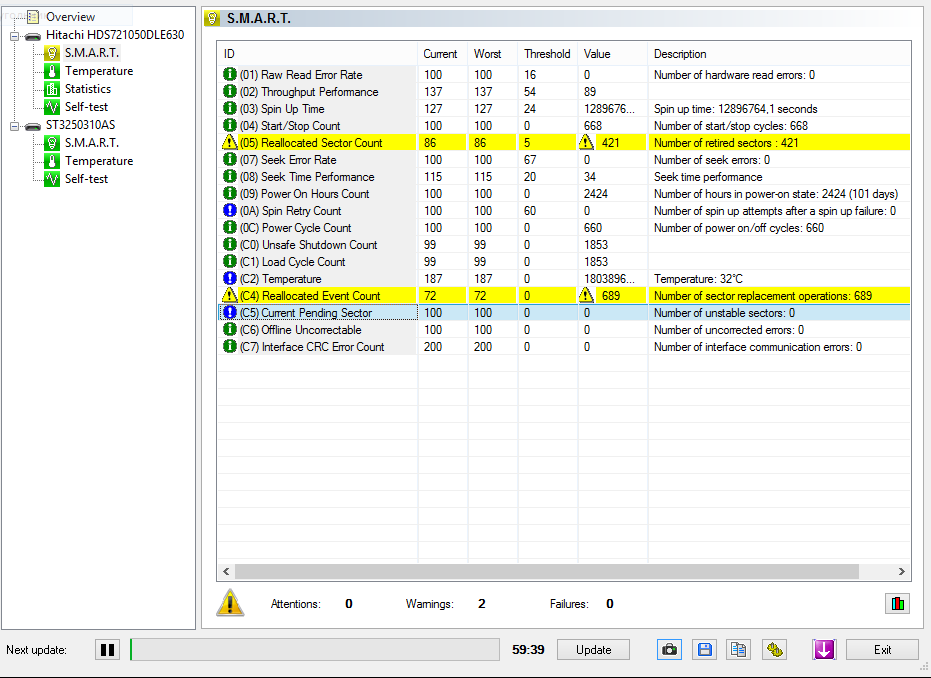Привет всем! ребят столкнулся с проблемой купил HDD Hitachi HDS721050DLE630 500gb, 5 месяцев назад, и у меня стали появятся зависания компа на секунд 10 конфиг компа в норме мать asus p9x79deluxe бп 1050 ватт термалтейк TPG Gold посмотрел смарт а там reallocated sector count 421 и reallocated event count 689 эти параметры постоянно растут когда пк зависает отдавал по гарантии сказали с диском все нормально поверхность нормальная, сам тестил MHDD все норм и ещё иногда при вкл компа он не загружается а диск стучит головой пока не выключишь комп кнопкой не включишь опять что посоветуйте делать ? форматировал его много раз прогой MHDD но нечего не меняется производительность тоже не очень по гарантии менять не хотят говорят бэдов нет значит все нормально.