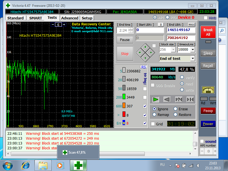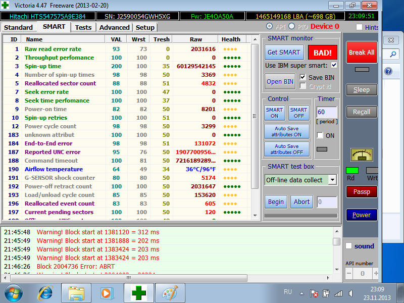 Ноутбук начал сбоить - приноровился запускать систему восстановления и гонять её по кругу в совокупии с ребутом. Подумал на HDD. Проверил память - все ок, а вот диск проверяться не желает - в livecd на подобии "Мультизагрузочный USB Flash Реаниматор 1.5", не хочет грузить MHDD и вику с флешек, MHDD с CD тоже не желает, Victoria с диска работает, но "отсутствует DRSC+DRDY или винт не снимает BUSY"(пути решения в духе потыкать в биосе не получатся - bios в ноуте этом до жути кастрированный) ну и HDD не определяет. На стационарном компе все работает. Victoria 4.46 из под винды не работает - выдает много ошибок, ругаясь на драйвер даже после перемещения онного в нужную папку. пробую Victoria 4.47(она не ругается) 8 бэдов найдены при проверки до 50% причем те 8 находятся где-то в первых 5%. Т.к. загружена в win то remap делать не может - ругается.