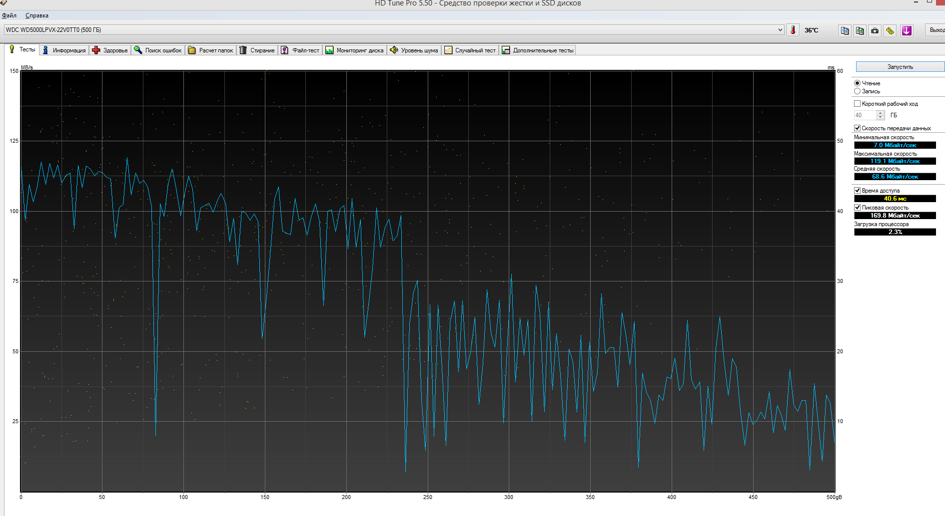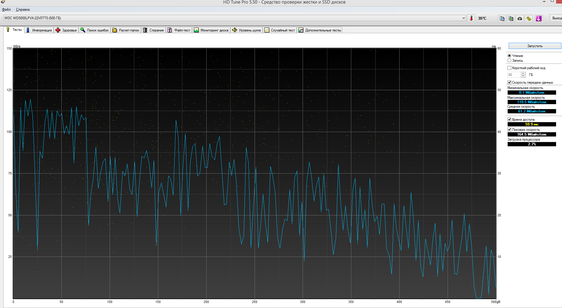 Есть HDD WD5000LPVX. Непонятно от чего скачет его скорость и так же медленно копируются файлы на нём. 1 большой файл копируется со скоростью 10 мегабайт в секунду, а может со скоростью 20 мегабайт в секунду, и Windows начинает тормозить, как будто винчестер загружен на 100%. Проверял скорость чтения Аидой и HD Tune. Не знаю от чего зависит, но скорость проверки скачет от нормальной до зигзагов. Вот 2 раза подряд прогнал тест и выдало разные результаты. С чем это может быть связано (медленное копирование файлов и при разные показания при проверке линейного чтения). Делал полную проверку chkdsk, и ничего.