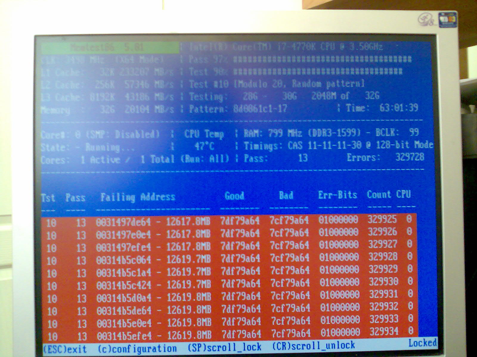 Тут надо сказать, что в предыдущие разы memtest находил ошибки то на первой минуте, то лишь спустя сутки непрерывного тестирования, так что я поставил тестироваться комп на двое суток, на всякий случай. Первые 8 часов все было нормально, а затем внезапно поперли ошибки в огромных количествах (см. фото). Перезапускаю тест - лезут ошибки в первую же минуту. Останавливаю комп, даю остыть 20 минут, запускаю memtest - уже 2 часа работает, ошибок нет. Перегрев? Охлаждение, кажется, в порядке, на фото видна температура проца.