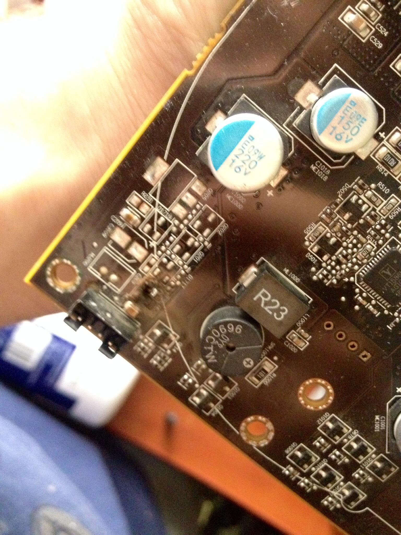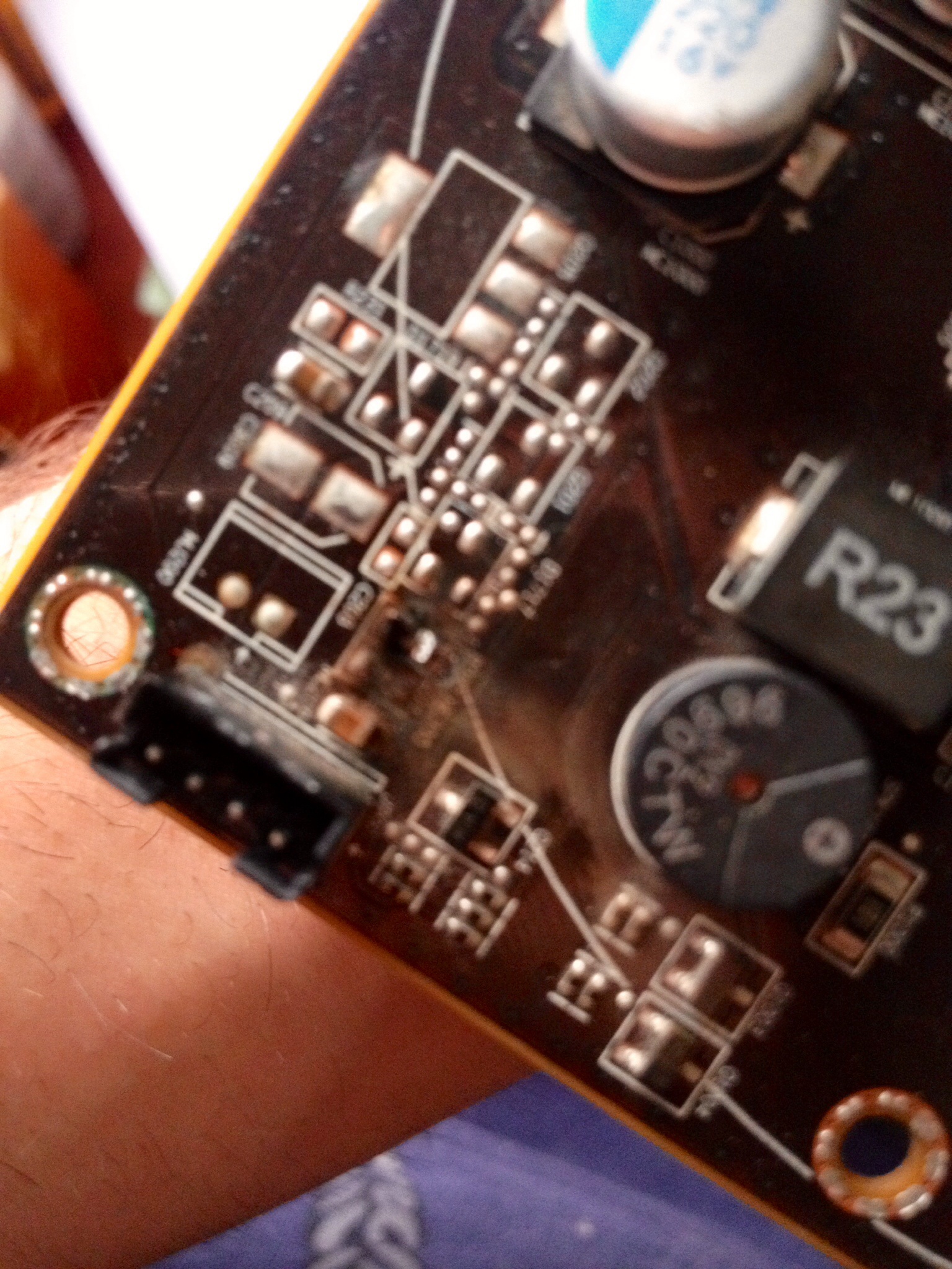 Здравствуйте. Поменял блок питания на компьютере с 650w на 1000w, после установки включил компьютер, а из видео карты пошел дым и загорелся красный свет(вентелятор сдох), я разобрал ее и вот что обнажил(далее на фото): Вопрос: можно ли это починить ? Почему так произошло ? - Спасибо !