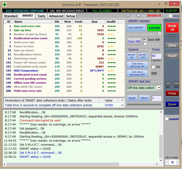 Периодически не определяется жесткий диск WD 20EARS 55MVWB0 2Тб (диск не основной) при выходе из гибернации или просто при включении. После выкл/вкл сзади, все ОК. История началась где-то полгода назад. Вдруг начал виснуть компьютер во время работы. Проверил на вирусы – чисто. Переустановил Win, не помогло. Поставил систему на SSD (до этого был тоже WD только на 500Гб) все осталось неизменным: раз на десятый мой «green» не определяется и где то раз в неделю виснет комп. Прогнал Victoria: ни одной даже зеленой ячейки. Что делать не знаю – прошу помощи. Заранее прошу прощения, если тема поднималась (не нашел) или открыл не в том месте (первый раз на вашем сайте). Спасибо.