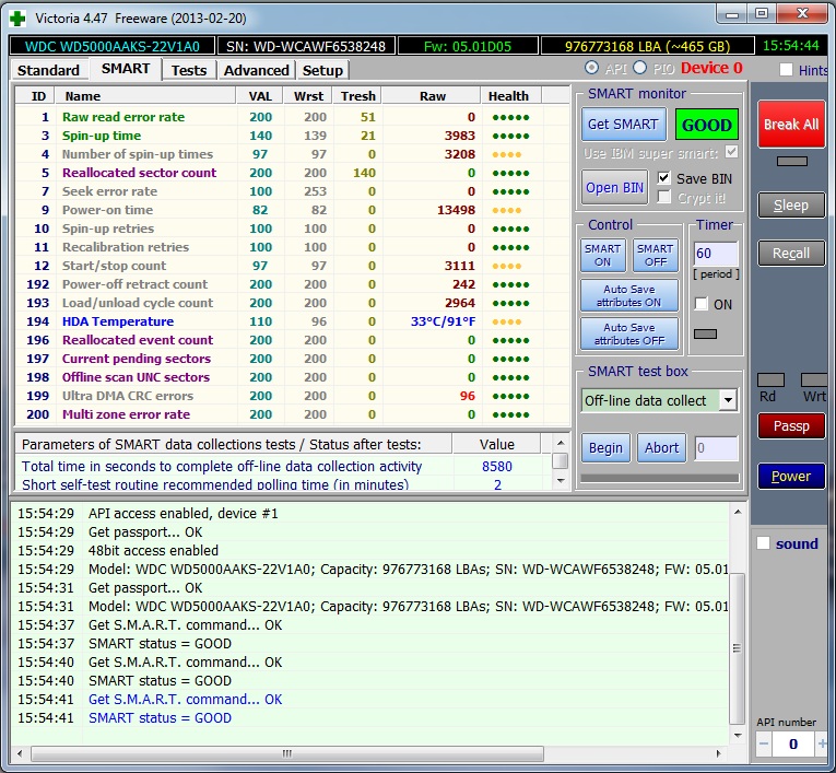 Что сделано: 1. Заменены ОЗУ и БП на заведомо рабочие - проблема осталась. 2. Проверен жесткий диск с помощью Виктории (результаты ниже). 3. Никаких "горячих" мест на мат.плате нет, железо в разгоне не было, вздутых конденсаторов нет. 4. Проверена софтовая часть (переустановка ОС, пошаговая установка драйверов и программ (KIS, DT и тд) - проблема осталась как с софтом так и с чистой ОС.
