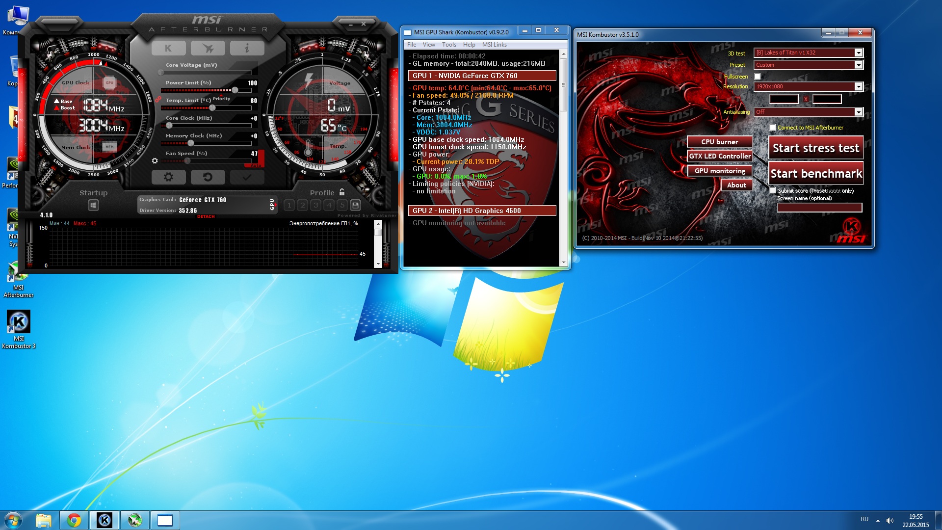 Операционная система Microsoft Windows 7 Ultimate Пакет обновления ОС Service Pack 1 - Чистый образ, не сборка Тип ЦП QuadCore Intel Core i7-4790, 3800 MHz (38 x 100) Системная плата Gigabyte GA-H97-HD3 rev 1.0 Чипсет системной платы Intel Wildcat Point H97, Intel Haswell Системная память 8057 МБ (DDR3-1600 DDR3 SDRAM) DIMM4: Kingston HyperX KHX1600C10D3/8G 8 ГБ DDR3-1600 DDR3 SDRAM подключена в 3 слот Тип BIOS AMI (06/26/2014) версия F5 Видеоадаптер Gigabyte GV-N760OC-2GD (Rev. 2.0) (2 ГБ) Дисковый накопитель ST1000DM 003-1ER162 SCSI Disk Device (1000 ГБ, 7200 RPM, SATA-III) Корпус №1 Miditower Aerocool <V2X Black> ATX После замены Miditower Thermaltake Black Versa H22 ATX Блок питания Corsair CX600M < CP-9020060-EU > 600W ATX (24+2x4+2x6 / 8пин) Cable Management Вентилятор Arctic Cooling Freezer 7 Pro rev.2 Cooler(775/1155/1366/754-AM2/AM3/FM1, 900-2500 об/м, Cu+Al+тепл. трубки) GlacialStars < IceWind 12025 (CF-1225GSD0AB0001) > for m / tower (3пин, 120x120x25mm, 20 дБ, 1000 об / мин) Монитор Philips273v