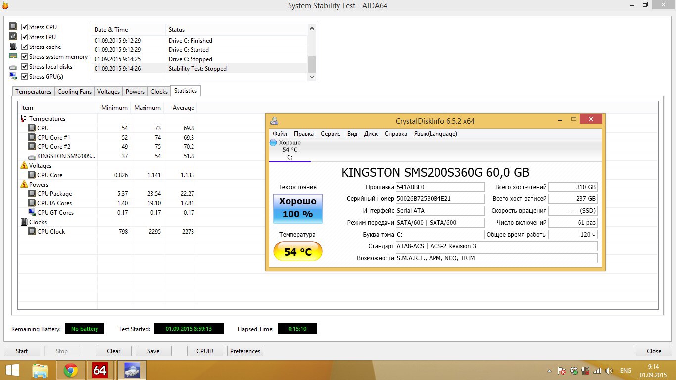 Время не имеет значения, нужно количество прогонов. Температура в норме, правда не стоит тестировать нагрев проца вместе с диском и видео. Ещё с батареей беда. Вы когда почистили со, недавно? Может проблема прошла когда почистили и после переустановили винду?