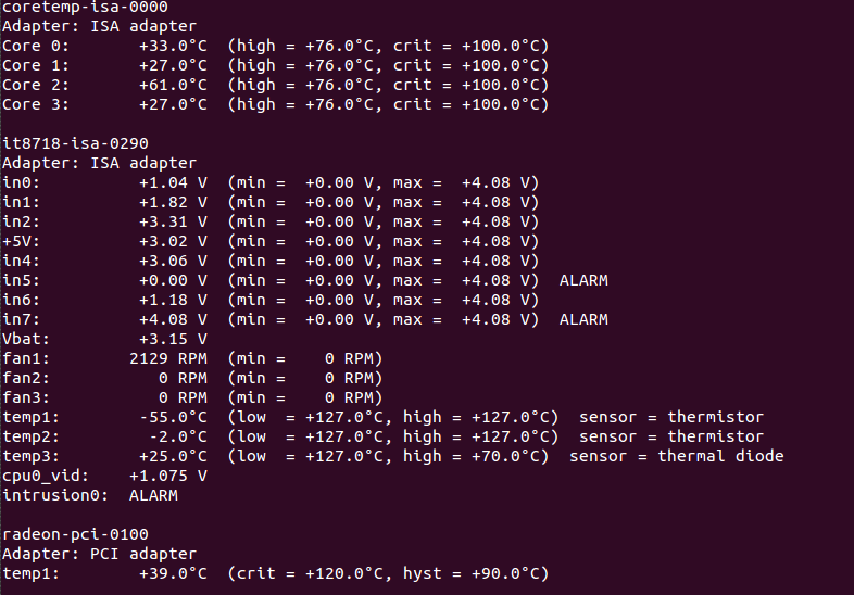 Здравствуйте! Хотелось бы узнать нормально ли, что температура 1 ядра ВСЕГДА, тобишь и под нагрузкой, и в простое(даже прямо после включения) всегда равна 61 градусу(тестировалось на убунту, окнах, разными программами). Возможно ли что это проблема с биосом(датчиками)? (2008 award) Посмотреть температуру можно на скрине ниже.