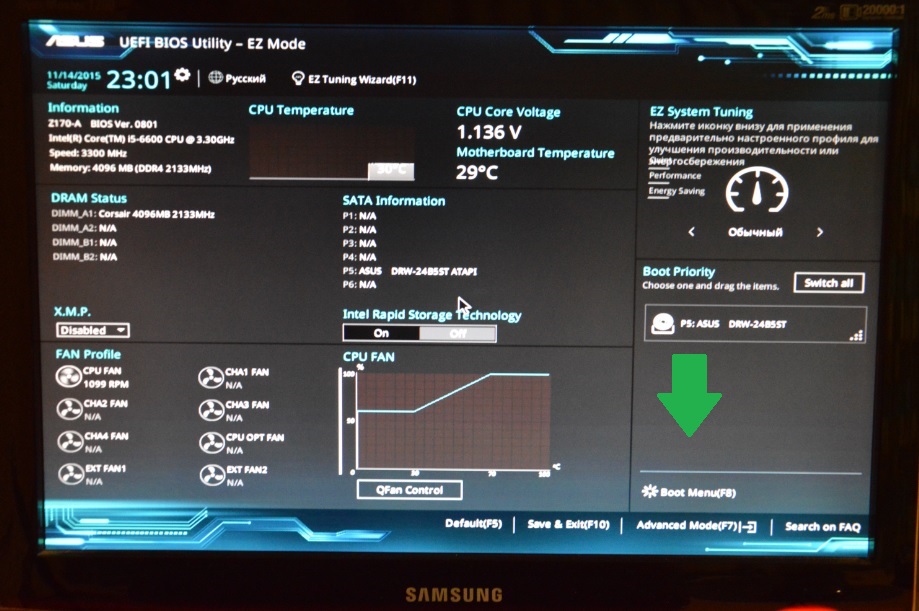 в Advanced Mode (клавиша F7); что за мать , могут быть сторонние контроллеры, нужно на интеловские SATA (по мануалу прочитать, голубые или белые (серые))