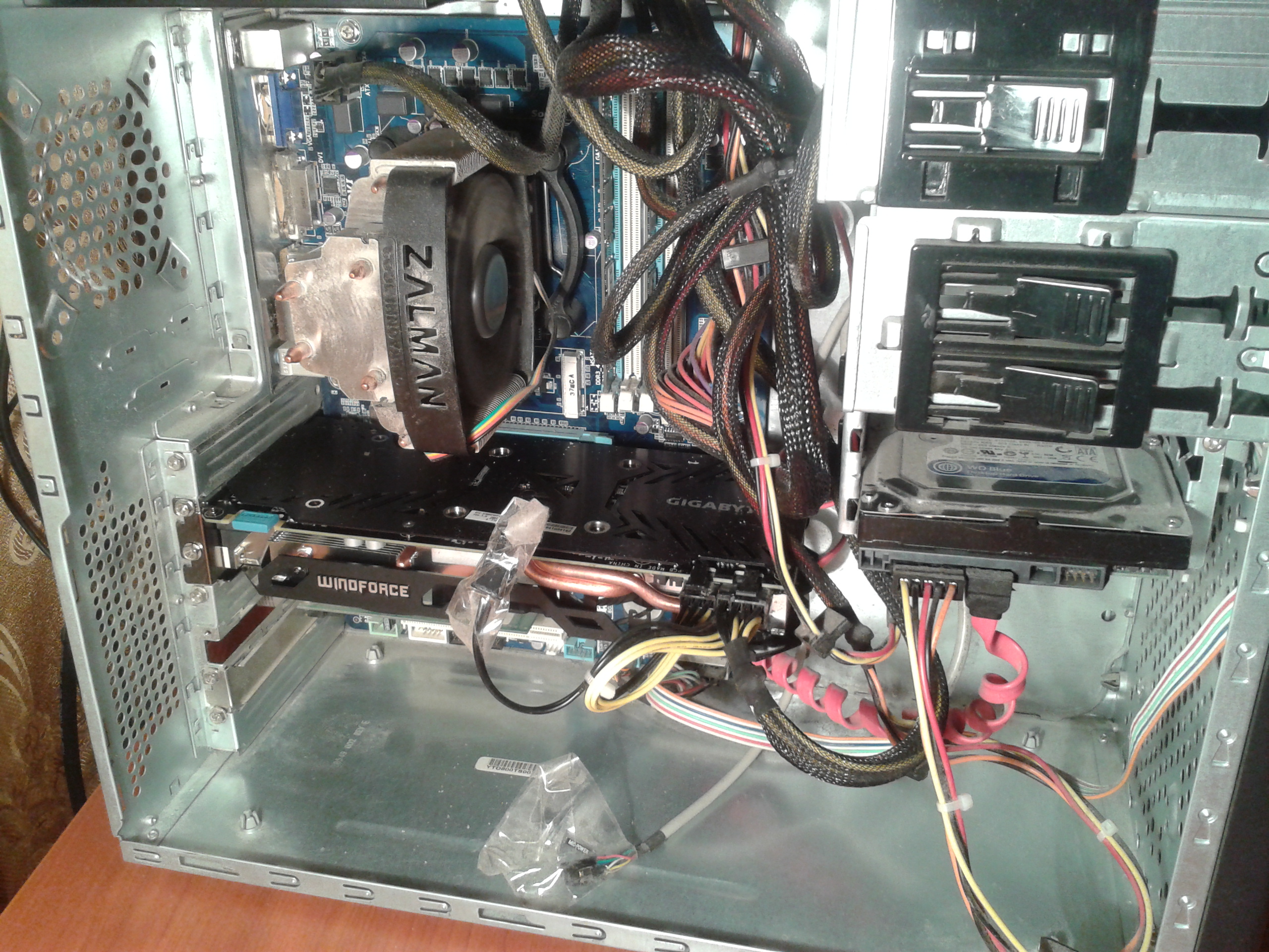Корпус - Foxconn? Ну если нервирует вас температура - ставьте вентиляторы на переднюю и заднюю стенки. А вообще, фото отвратное - на видеокарте перхоть какая-то, повсюду пыль, мешанина из проводов и куски грязного скотча. Да, и нижняя защёлка занятого слота памяти до конца не закрыта. Ужс-ужс.