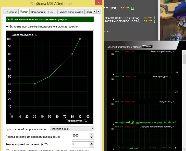 Всем привет. В общем, при установке MSI GTX 980 Ti Gaming 6g "из коробки", вентиляторы не крутились вообще. В простое температура видюхи была 50 градусов примерно. При запуске игры вентиляторы активировались, не знаю на какой температуре правда, максимальная температура была 78 градусов в игре. Поставил фирменную утилиту MSI, включил там пользовательские настройки кулера, теперь вентиляторы в простое крутятся на 40-50% и температура 36-42 градуса (настройки приложил в файле). Собссно, вопрос таков: как думаете, что лучше - пусть стоит по дефолту в простое 50 градусов без охлаждения или все-таки включать эту утилиту, чтобы вентили крутились даже без нагрузки? P.S. Какие для нее вообще температуры считаются нормальными в простое и в нагрузке?
