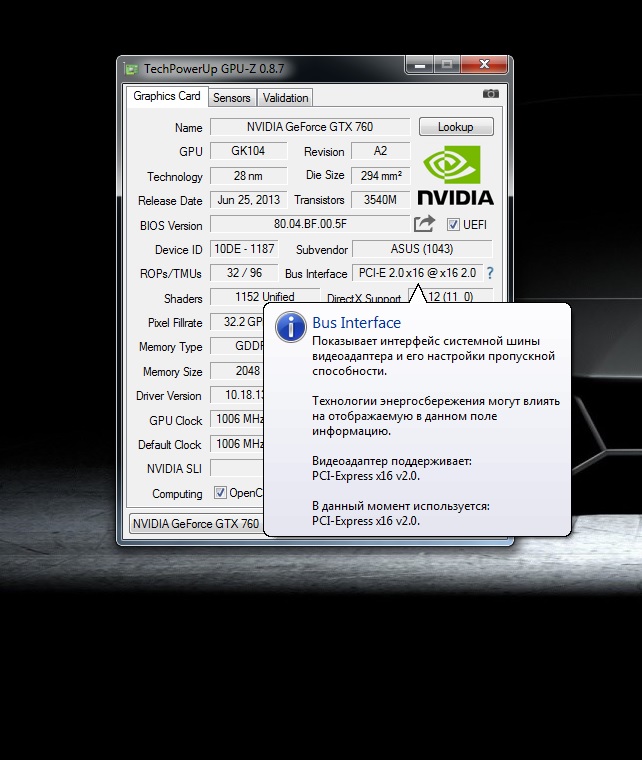 Процессор - Intel® Core™ i5-4670K Processor (разгон до 4120MHz) Материнская - плата Asus Z87M-Plus Видеокарта - NVIDIA GeForce GTX 760 2gb ASUS GPUZ показывает что поддерживается PCI-E2, в БИОСЕ тоже нет значения gen3, только авто, gen1, gen2. Драйвера видеокарты последние, версия БИОС 1107 (последняя) Видеокарта вставлена в желтый (верхний) слот.