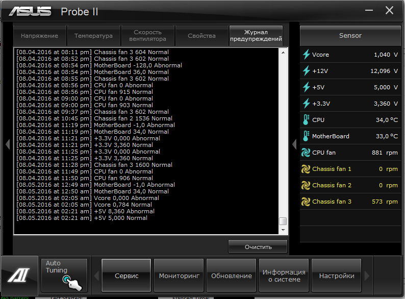 Так вот, иногда срабатывает asus anti-surge бывает очень редко и только в простое, под нагрузкой в любых тестах все нормально. Тоже самое происходит на встроенной видео и с другим процом. Недавн покопался в биосе и чет включил из энергосберегалок, хз может повлияло. Сегодня же запустил аиду в фоне и асус сенсор рекодер, так вот что вышло: