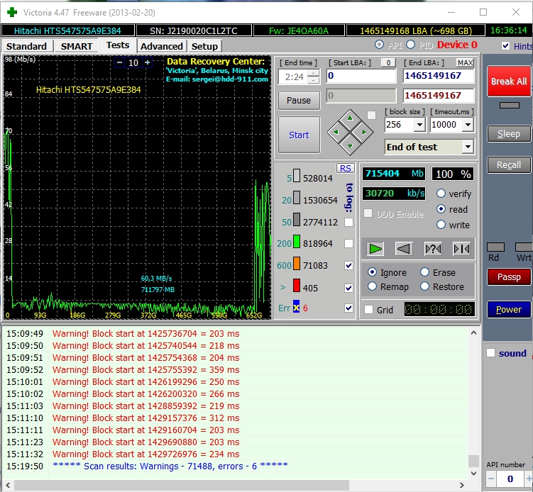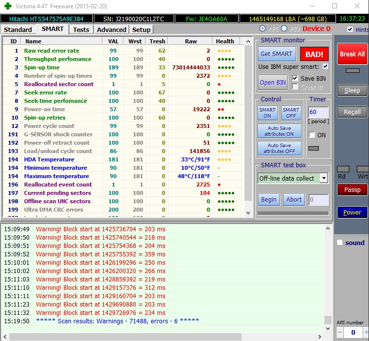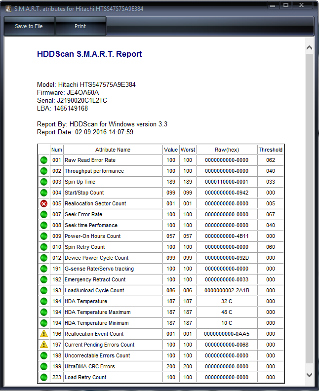 Диск Hitachi HTS547575A9E384, диску больше 4 лет. Работает, но последнее время всё чаще появляется windows-овское сообщение о проблемах с жёстким диском. Нередко зависает проводник, раздувая процесс Проводника до >2 Гб, с последующим снятием зависшей программы. Результаты HDDScan - во вложении. http://joxi.ru/VrwpxOohK6dD7m