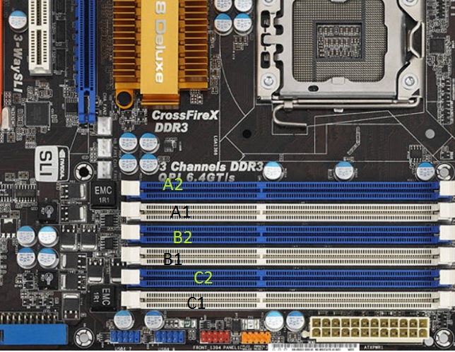 Проблема: Пол года назад экспроприировал данный системный блок, в нем стояли 2 планки Corsair. ни биос, ни cpuz, ни windows не видели 2ую, которая была установлена в B1. Эта же планка работала и определилась биосом, cpuz, windows в слотах A1,A2,C1,C2. Докупил одну планку Kingston, также работает во всех слотах, кроме B1,B2. Понимая, что значительной разницы в моих задачах не будет, оставил все это дело работать в двухканальном режиме. Неделю назад тыкал оперативную память в разные слоты, после часа этого интеллектуального занятия оперативная память заработала в трехканальном режиме (A1,B1,C1). Эстет внутри победил, были куплены 2 планки Kingston, эквивалентные 1ой. Однако, они в трехканальном режиме запускаться не пожелали, также работая во всех остальных слотах, кроме B1,B2. Если заполнить слоты A1,A2,C1,C2 и поставить память в B2, то биос, windows ее не определяют, cpuz видит.