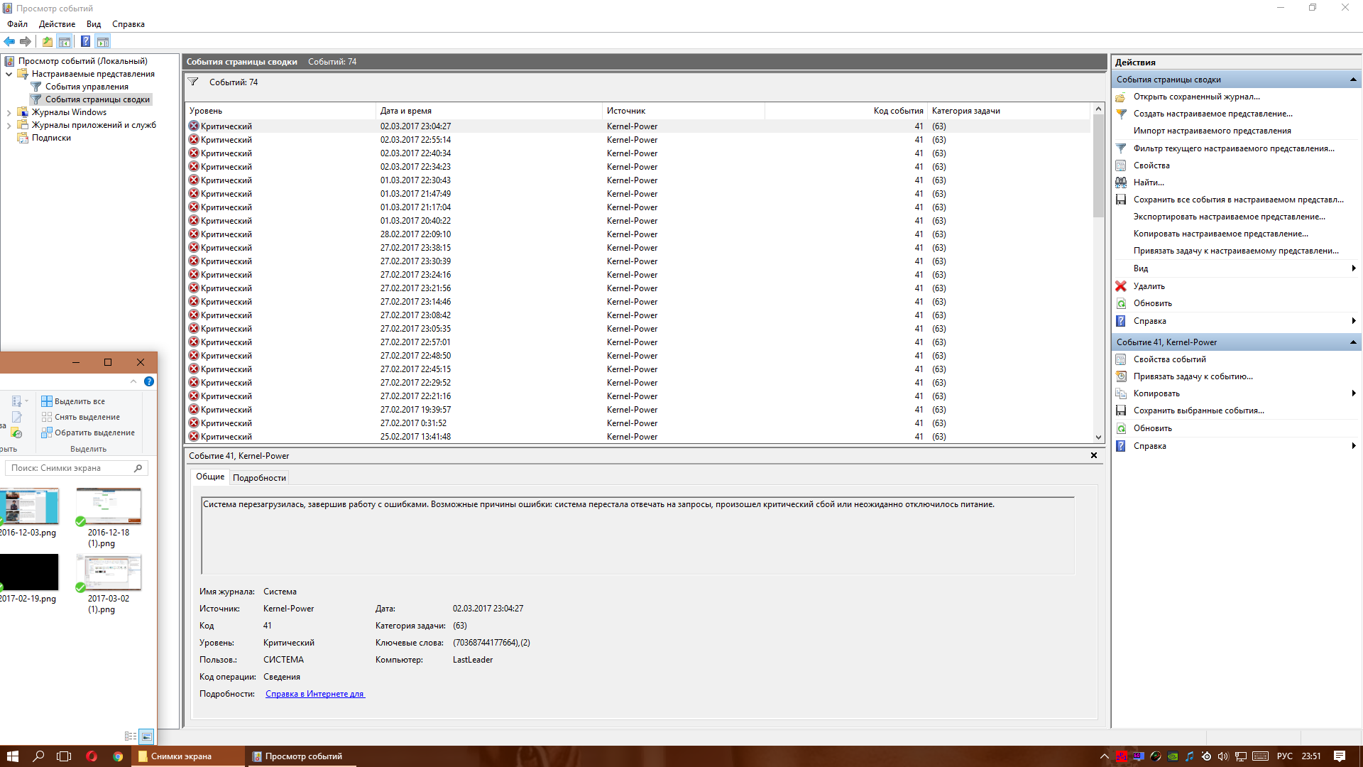 Ошибка прописывается там почтив всегда при загрузки системы, я со своей стороны уже убирал разгон, сбрасывал все в биосе на дефолт, сменил БП, пробовал другую видеокарту - ничего не помогает. При этом при разгоне в 4.5 ГГца система проходит все тесты, Прайм гонял более 6 часов - ошибок нет. ЛинХ - все ок. Прочие стресс тесты - все ок, в играх все - ок. Единственное периодический система стала дольше грузиться, долго горит индикатор чтения винчестера и потом она загружается. Но сейчас например этого нет, а ошибка есть. Я недавно менял на материнке батарейку, может в ней косяк, думаю поменять снова. Проблема сама по себе началась вроде не очень давно, я ее обнаружил когда сменил видеокарту и решил с 4.2 ГГц разогнаться до 4.5, тогда подбирая напряжение я и нашел ее в логах. Процессор - Intel Core i5-2500K, 4500 MHz Материнская плата - ASUS P8Z77 LX Оперативка - DDRIII 4096Mb 1600Mhz Corsair x4 (16 Gb RAM) Видео - Gigabyte 1070 g1 gaming Винчестер - Western Digital WD2002FAEX - 2000Gb SSD - Kingston 120 Gb БП - Gigabyte G750H Копус - ATX Thermaltake ArMor A90 Охлаждение ЦП - IceHammer 4401+ ОС - WINDOWS 10 15025 Скриншоты системы: