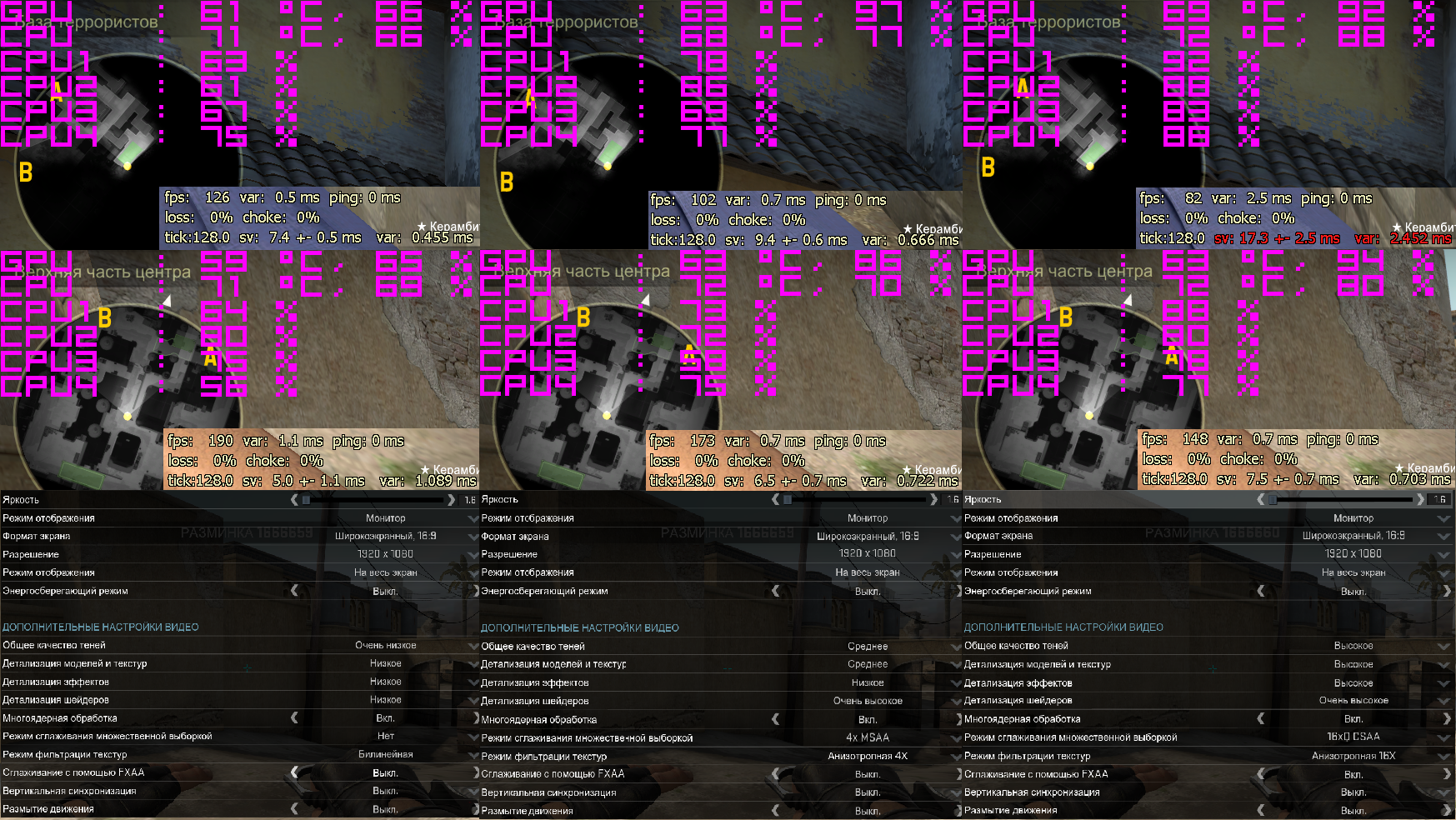 Собсна сам Csgo. Замеры в лобби без ботов на 2 картах в одинаковых местах. Сначала идёт полоска на новенькой карте inferno, затем dust2, ну и настройки графики. Как видно, абсолютно везде процессор не загружается более чем на 80%, при этом видеокарта зачастую нагружена на 90%. Если смотреть минимальные настройки, то там вообще загрузка и процессора, и ВК около 65%.