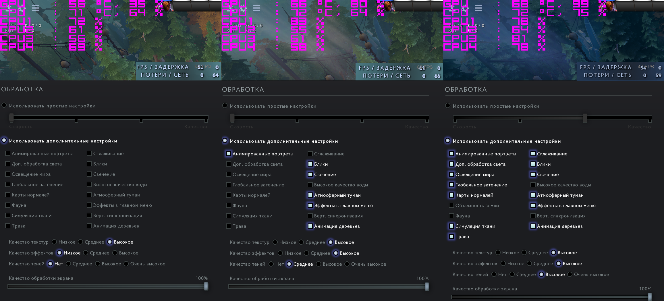 Дота 2. Замеры были сделаны в лобби без ботов в одной и той же точке карты. Как видно, при минимальных настройках загрузка ВК 35%, но процессор опять прохлаждается - всего 64%. При повышении качества графики загрузка ВК возрастает до 80%, но загрузка ЦП не меняется. Меняется она лишь на высоком пресете графики, где ВК загружена на 99%. Что с моим конфигом не так? Кто-то сталкивался с такой ситуацией? Как решить проблему неполной загрузки процессора? Заранее спасибо.