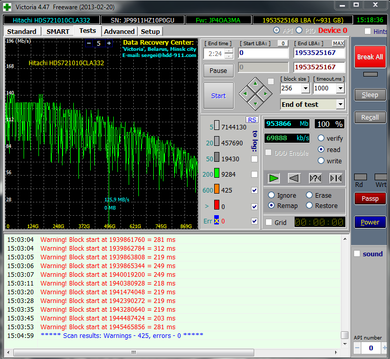 Добрый день всем! Год назад вышла из строя видеокарта, из-за чего заменил ее на новую, заодно планово почистил системник от пыли и поменял термопасту. Вроде бы все хорошо, но заметил, что начал проседать FPS при просмотре видео. Долго ломал голову, в чем же проблема, даже в сервисном центре не ответили. Этим компьютером пользуюсь очень редко, так что решил не обращать на это внимание. Но сегодня решил проверить жесткий диск (hitachi hds721010cla332) на наличие бэд-секторов. Victoria показала такую картину. Нужно менять такой HDD?
