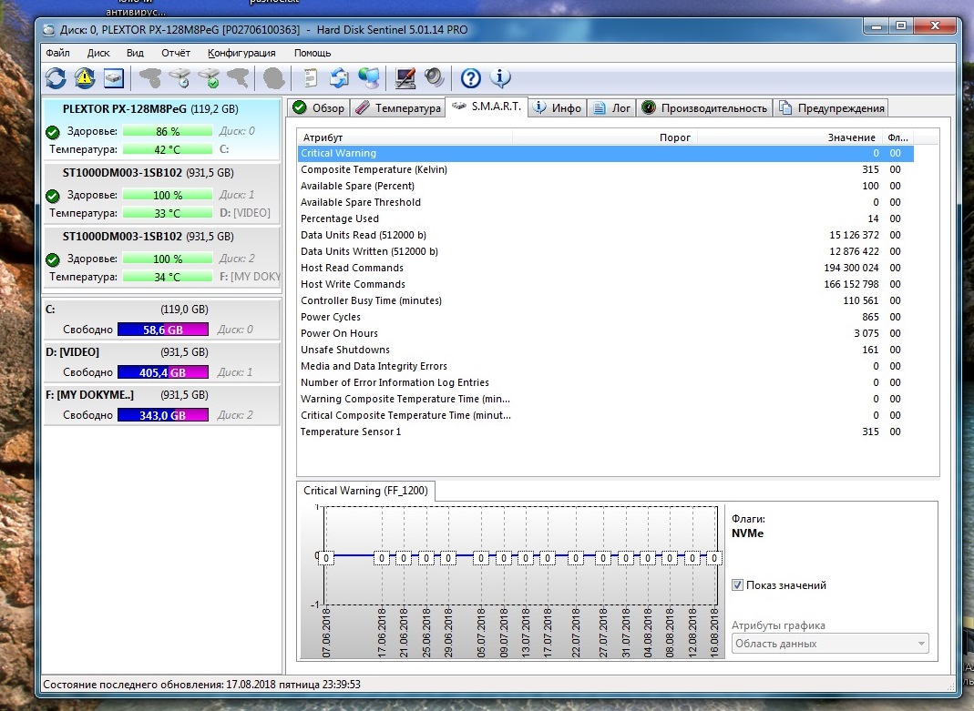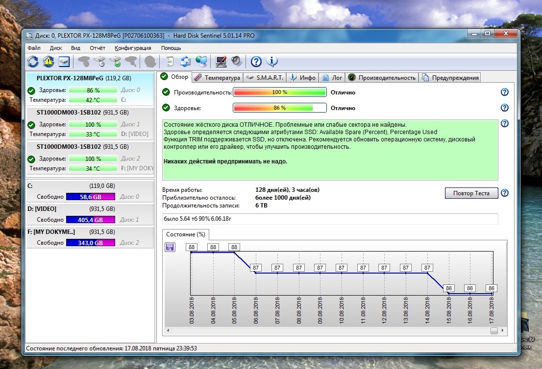 Plextor 128m8peg, программы показывают быстрое снижение ресурса диска.Диск заполнен на половину стоит система win7 64 bit, мать на z170, в игрушки не играю, программ с плотной перезаписью диска как мне кажется нет, если только браузер. Заявленный производителем ресурс диска 192 Тб, на данный момент записано всего около 6 Тб (это около 3% от ресурса), а ресурс упал на 14%.Диску 1,5 года , по моим расчетам при такой деградации он сдохнет через 2,5 года. Фирменная утилита от производителя не может обнаружить свой же ССД соответственно невозможно и посмотреть и смарт на ней. Скрины сторонних программ привожу, они и говорят что он стареет как рыба тухнет. Что делать, обращаться к производителю? или не обращать внимание на интерпретацию смарта сторонними программами.