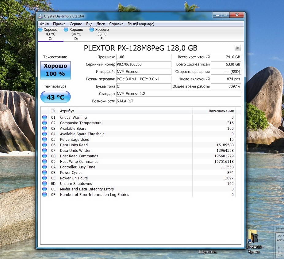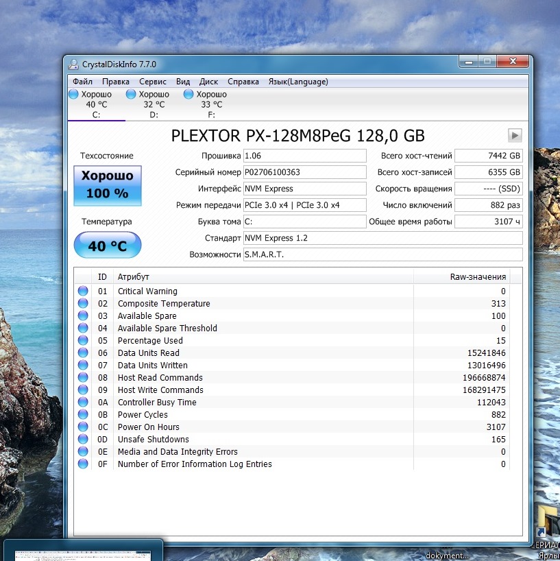 Мать GA-Z170HD3 DDR3, память 8гБ,есть еще 2 HDD на 1 Тб от Сигейта, ССД установлен в слоте м.2, зашел в биос, не нашел режим работы слота м.2, но в Кристал диск инфо обозначено что ССд работает в режиме PCIe 3.0x4, драйвер NVMe PLEXTOR PX-128M8 SCSI Disk Device от Microsoft, Винда сборка win7 SP1 64 bit, обновления установлены до мая с.г. , Бп 550W купил в мае с.г., ЦП i3-6100, установлен ТВ тюнер от Бехолд. А расчет отказа ССД у меня простой, установлен 10.06.18г с 92% ресурса, сейчас конец августа 85% ресурса, т.е снижение 7% делим на 2,5 мес=2.8% за месяц, 85% оставшегося делим на 2,8% в месяц =30,7 месяца т.е 2,56 года.