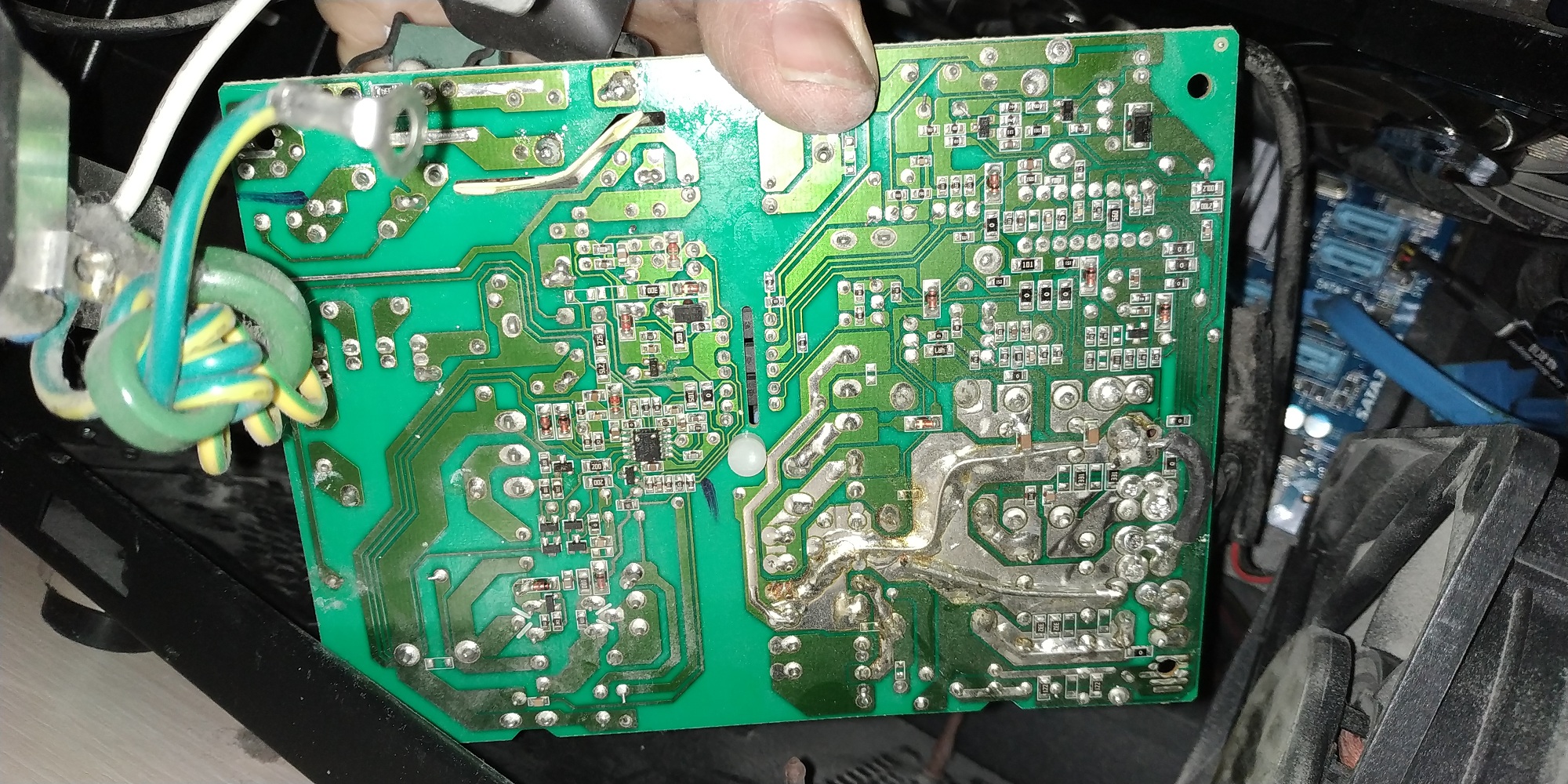 Stan74 Под подозрением увидел место только на 134633 jpeg - очень потемневший дроссель групповой стабилизации 5-12 v сильно грел две емкости - 3300mf x16 v ( шина 12 v) и более мелкий по -12v. Электролит вскипал, но выдавил с нижней части пластиковую заглушку. Она, давя на текстолит, отклонила кондеры от вертикали. Хотя могли и на заводе специально наклонить от горячего дросселя. Детальней не разглядеть Полюбому - на диагностику спецу, а на Ваш комп подкинуть заведомо исправный, по мощности не менее 40 - 45Ам по единой 12 v линии.