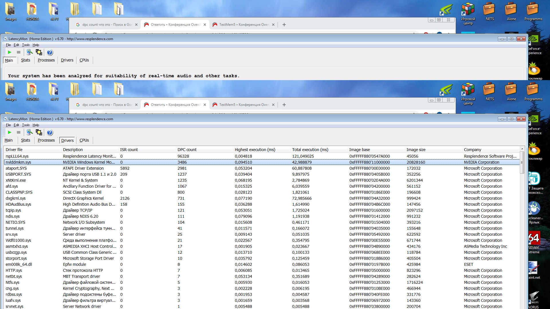 Спасибо за ответ, проверил тестмемом 5 в 0.12, ошибок нету. Правда я частоту уже снизил на 1333. Не знаю играет ли это роль. latency monitor'ом смотрел, все было хорошо. Через некоторое время задержка вырастает примерно до середины (если по полоскам смотреть). Я не совсем понял что такое dpc count и др параметры, но в строчках задержки пишут rspLLL64.sys и nvlddmkm.sys типо у них большая задержка, в принципе как на скриншоте мэйн только там задержка больше, примерно до середины Дрова чистил как написано в теме, и исправлял шибки системы. Пока не оч. Посмотрю как на 1333 опера будет работать. До этого разгон маленький стоял, и напряжение на оперу и проц вручную. Щас все убрал. Будет видно. Хотя я уже ставил биос на сток, и как то не оч помогало