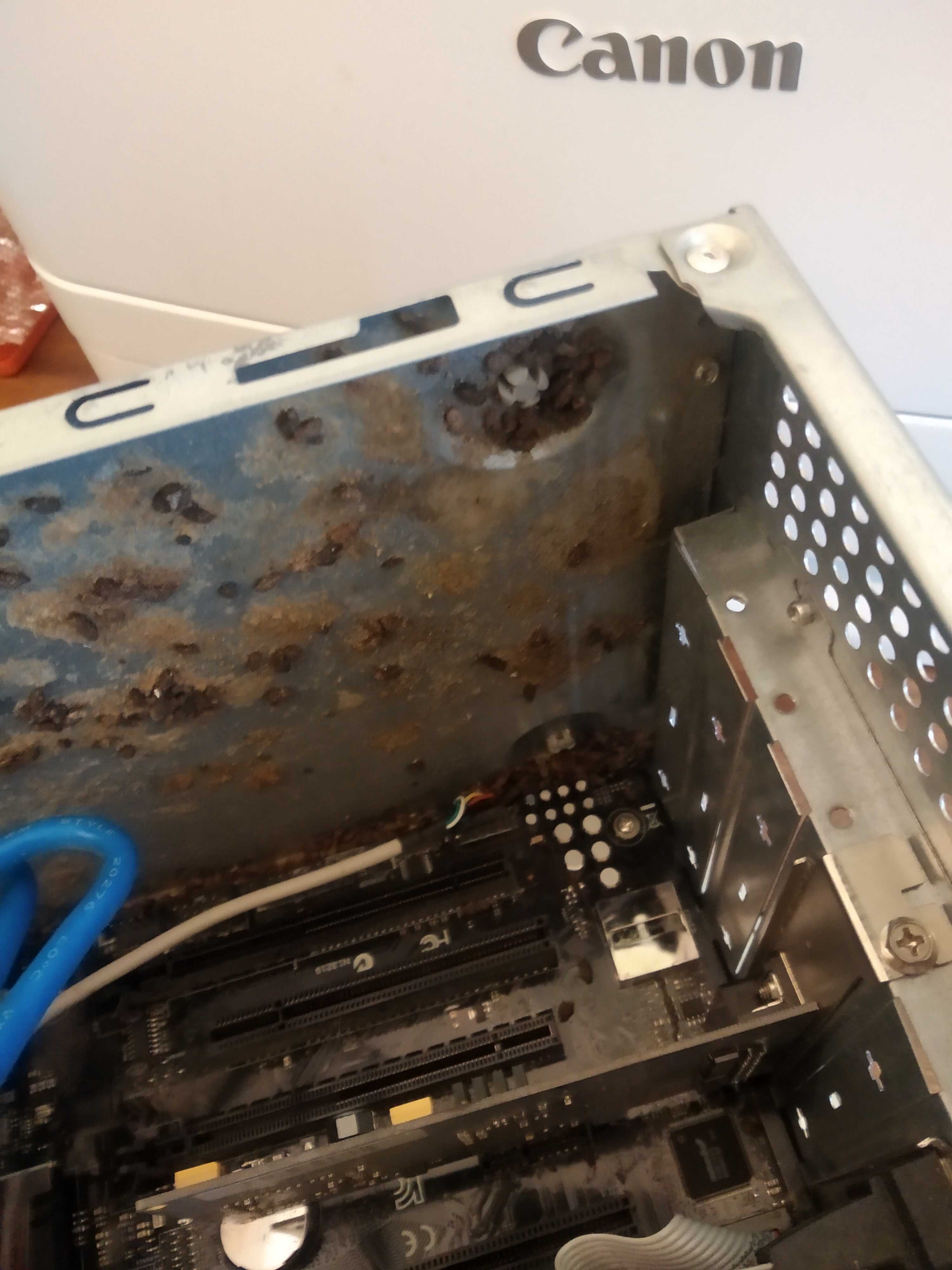 Добрый день уважаемые формучане. В НИИ, где я работаю случилась неприятность с компьютером. Был компьютер, который одно время записывал ЭЭГ мышей. Потом от был отключён: с июля 2019г. Сейчас я его включил, посмотрел и выключил, но он вдруг стал самопроизвольно включаться. Я открыл его и обнаружил, что внутрь проникла мышь, записила, закакала и сдохла внутри. Закакано дно корпуса и следы мочи и фекалий на видеокарте и первом слоте PCI-E 16x.