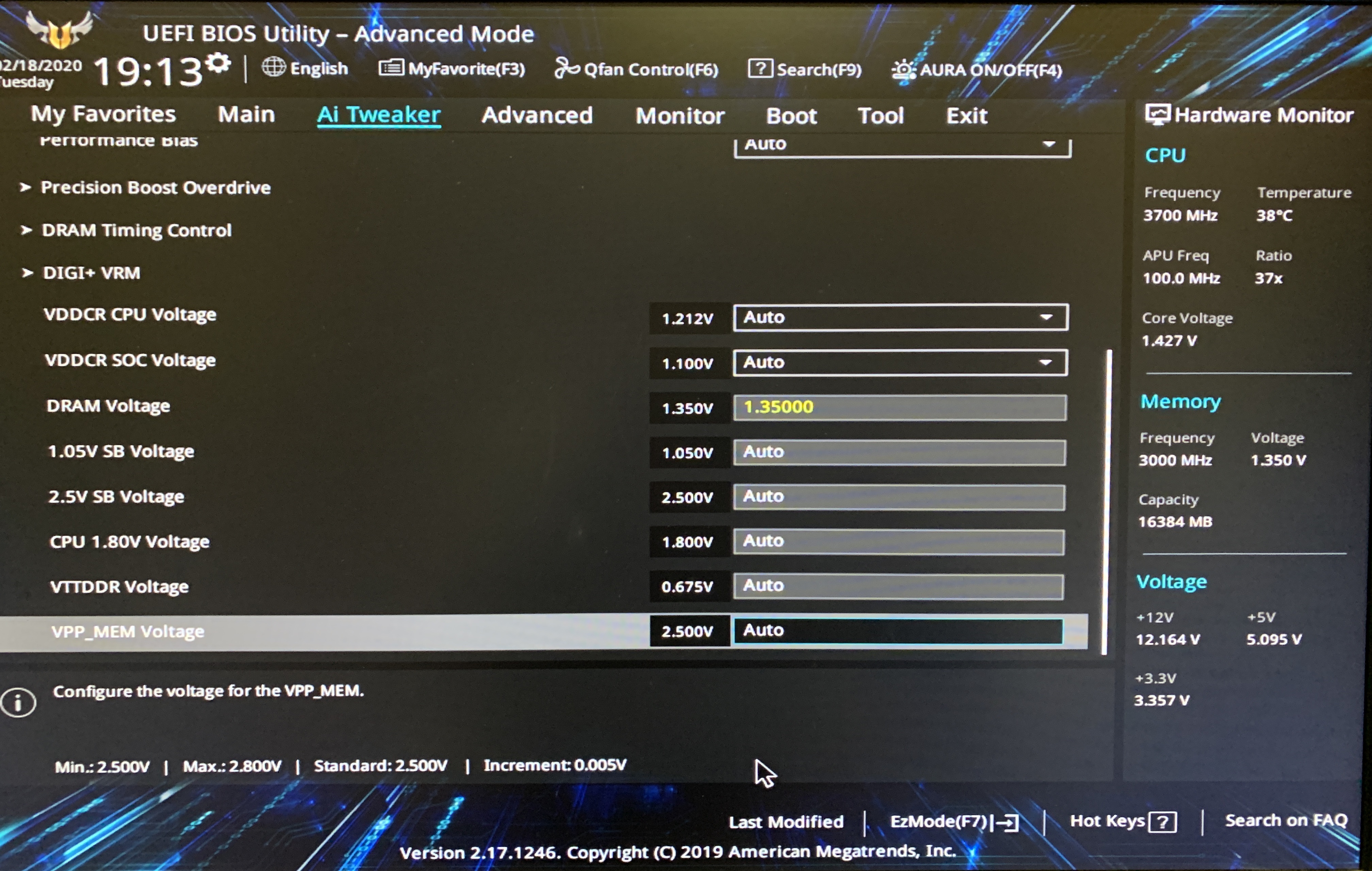 Оверы, добрый вечер. Друг поменял старую систему на базе й5 2500к на райзен 2700х с материнской платой asus b450 pro gaming и 2х8 гб ддр4 3000 Мгц. (печ 1070 осталась со старого компа). Производительностью доволен. Говорит, что в far cry new dawn просто небо и земля. Единственно он попросил меня посмотреть, все ли правильно настроено в биосе. Т.к. там все по-другому и вообще ничего не понятно. В общем биос отличается от моего на asus p8 z77 вообще от слова совсем. И первое, что мне бросилось в глаза, это напряжение на процессоре - по мониторингу 1.4В! Это вообще нормально? Я на своем 32нм 2600к не рискую ставить такие напряжения. В биосе куча не понятных пунктов со значением - вкл/вкл/ручной режим. Все что я смог сделать, это включить аналог хмп, что бы память заработала на 3000Мгц и поставил значение LLC на минимум, что бы мамка не задирала напряжения. В общем помогите с настройкой биоса. Другу просто нужно, что бы в простое проц скидывал частоты и напряжение, а под нагрузкой бустил, то что ему положено по ттх. Разгон, подбор таймингов, рекорды... ему это не надо. Спасибо за помощь.