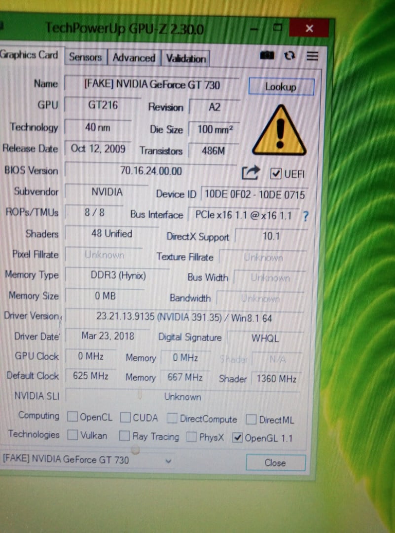 Здравствуйте, уважаемые пользователи форума. У меня возникла проблема с видеокартой, а точнее с ее подлинностью. Покупал ее в 14 году в dns, когда еше не разбирался в железе толком. После долгого пыления этой карты на шкафу, решил ее достать. Не устанавливались драйвера, потому как у меня архитектура fermi, решил установить дрова 390.35, но не эти дрова и не более старые не ставились. Так как стояла виндовс 8.1, решил поставить 10, чтобы она сама поставила драйвера. В итоге поставила 340.42 (точное название не помню к сожалению). Потом скачал gpu-z, и карта определяется как фейк, память hynix, хотя на плате отчетливо видны банки памяти samsung. Вга биос при загрузке и в гпу з 70.16.24. Что делать? Как найти "родной" биос? p.s название на чипе стерлось.