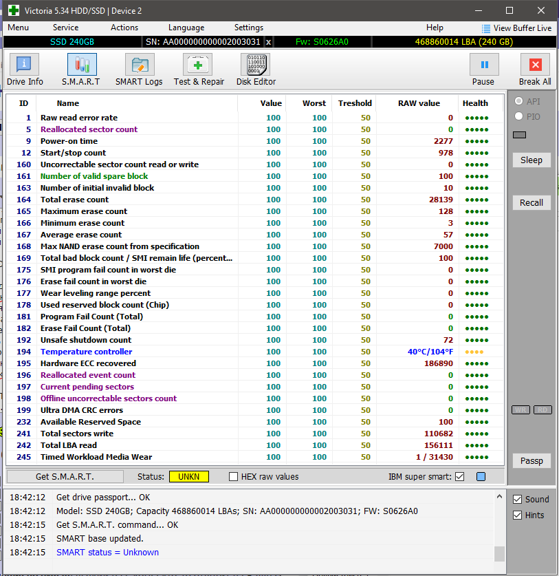 Ну, вроде бы конфиг описал, теперь к сути. Попытаюсь описать его неадекватную работу максимально подробно. Системнику примерно год, почти с самого начала сборки посыпались синие экраны и иногда бутлуп. Ошибки были разные постоянно, по кодам ошибок в журнале сослаться можно было либо на оперативную память (была китайская) либо на SSD (К тому моменту SSD благополучно отработал уже больше года). К сожалению коды ошибок уже не скажу, были стерты при замене винды, но и ее менял не просто так! Первоначально как и любой адекватный человек, я грешил на оперативу, китайское подвальное де-мо, после стресс тестов оперативной памяти версия отпала, но не на 100%. Далее стал смотреть состояние SSD через викторию, смарт отличный, проверку секторов проходит нормально. Проверяю блок питания под нагрузкой в АИДе, смотрю просадки по предельно допустимым значениям, все в допусках, не более 5%. Тестера у меня под рукой нет, но думаю что и такого теста было достаточно. Было принято решение купить новый SSD Smartbuy jolt 240 и оперативу ADATA XPG DDR4 2133 4Gb х2. После замены все вроде бы нормализовалось, примерно на месяц и я успокоился (системник был в покое). В один "прекрасный" день, мне не пришлось отключить системник от всех проводов и отставить на несколько часов. По его возвращению на место, после включения компьютер зависал примерно на минуту на заставке Биоса, а спикер предательски молчал. Примерно через минуту окно пропадало и компьютер выдавал ошибку загрузки, попытки зайти в биос были такими же медленными. Уже в биосе выяснилось, пропал ССД. Отключив новый SSD все заработало моментально и искрометно. Накатив винду на другой диск стал искать причину пропажи SSD из системы, но найти и понять не смог. Подключаю его к старому системнику, он определяется, винда ставится, виктория показывает хороший смарт, проверку проходит без ошибок. Такая же ситуация и на еще двух компьютерах, на всех кроме моего. Единственный способ, благодаря которому мне удалось его подключить к своему системнику, это переходник на USB Смарт его так же прикладываю (показывает с USB). Так же хочу обратить ваше внимание что на разных SSD проблемы слегка отличаются друг от друга, на ADATA игра CSGO часто ругается на отсутствие каких-либо файлов, в браузере крошится долго открытая страничка ютуба с ошибкой - Сбой загрузки страницы.