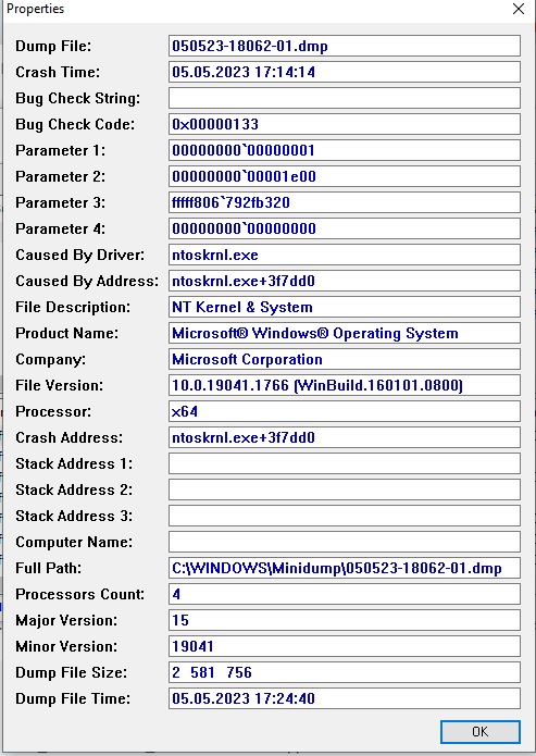DPC_WATCHDOG_VIOLATION (133) The DPC watchdog detected a prolonged run time at an IRQL of DISPATCH_LEVEL or above. Arguments: Arg1: 0000000000000001, The system cumulatively spent an extended period of time at DISPATCH_LEVEL or above. The offending component can usually be identified with a stack trace. Arg2: 0000000000001e00, The watchdog period. Arg3: fffff804082fb320, cast to nt!DPC_WATCHDOG_GLOBAL_TRIAGE_BLOCK, which contains additional information regarding the cumulative timeout Arg4: 0000000000000000